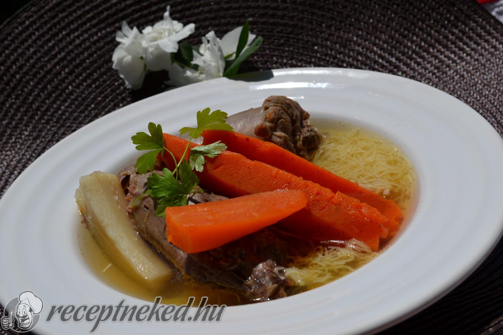 Tálalásnál teszünk a tányérba a főtt zöldségből, erre szedjük ki levest és aki kéri, teszünk a levesbe pulykanyakat.