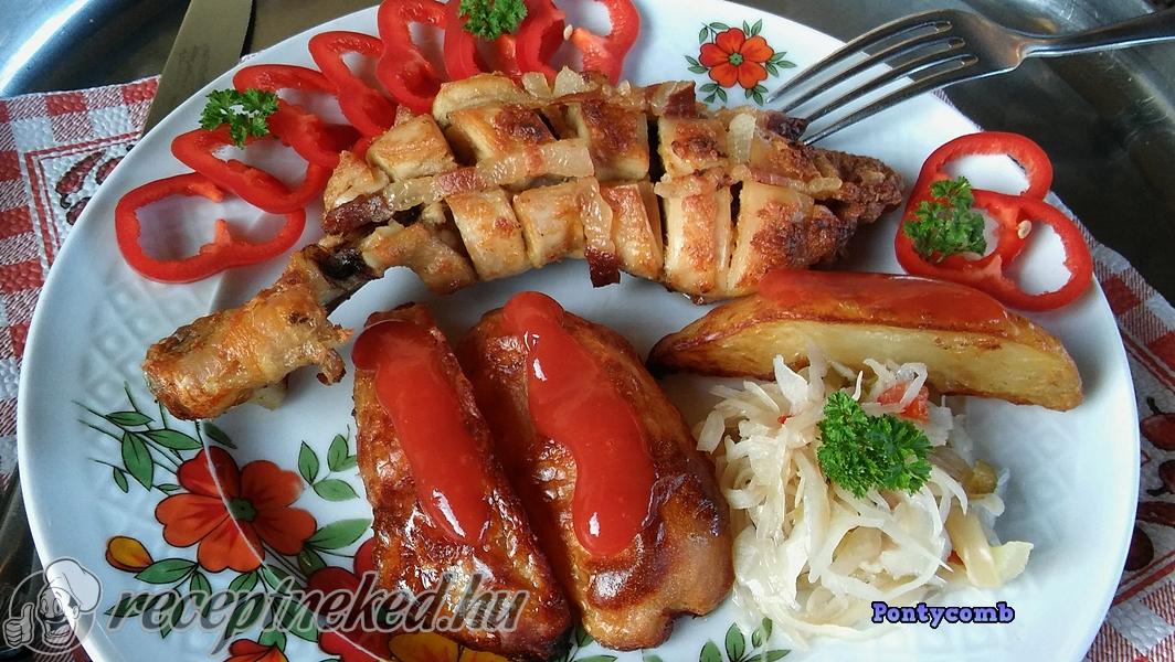 Miután a csirkecombok átpárolódtak, a keletkezett levét leöntjük róla (kis tepertők maradjanak a tepsiben) és a combokat egy éles késsel mélyen berácsozzuk.