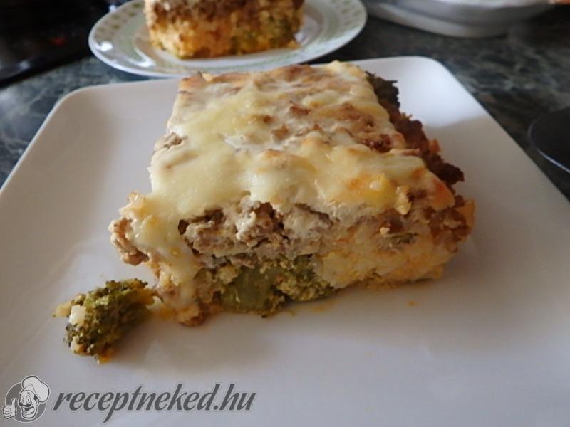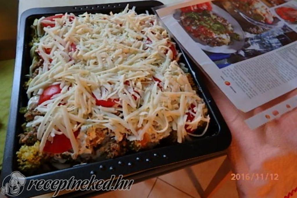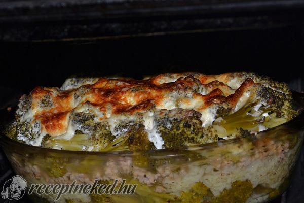 Egy sütőtálat kikenünk olajjal, elterítjük benne a főtt brokkoli felét, majd sózzuk, borsozzuk és kevés szerecsendiót szórunk rá, ajd ráhalmozzuk a bekevert darálthúst és elsimítjuk. Befedjük a brokkoli másik felével és szintén ízesítjük sóval, borssal, szerecsendióval.
