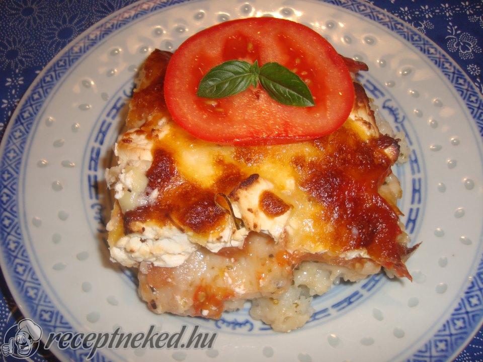 A visszamaradt olajat egy tepsi aljára öntöm, erre jön a rizs, összekeverem az olajjal. Ezután szép sorban ráhelyezem a húsokat, megszórom az oregánóval, ezután jön a karikára vágott paradicsom, végül a sajt.