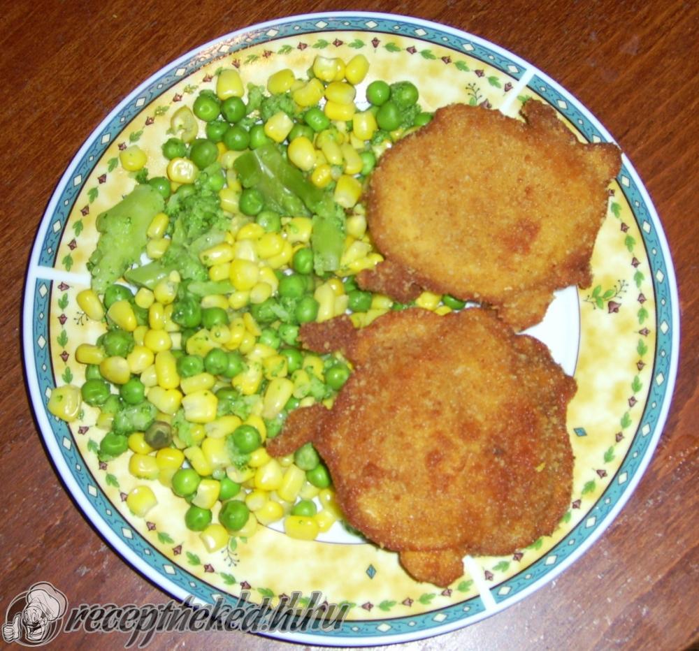 Ezt követően a szokásos módon panírozunk: a hús szeleteket liszt, a csoki kinézetű lenmag kocsonya és a reform morzsakeverékbe forgatjuk, majd fritőzben kisütjük.