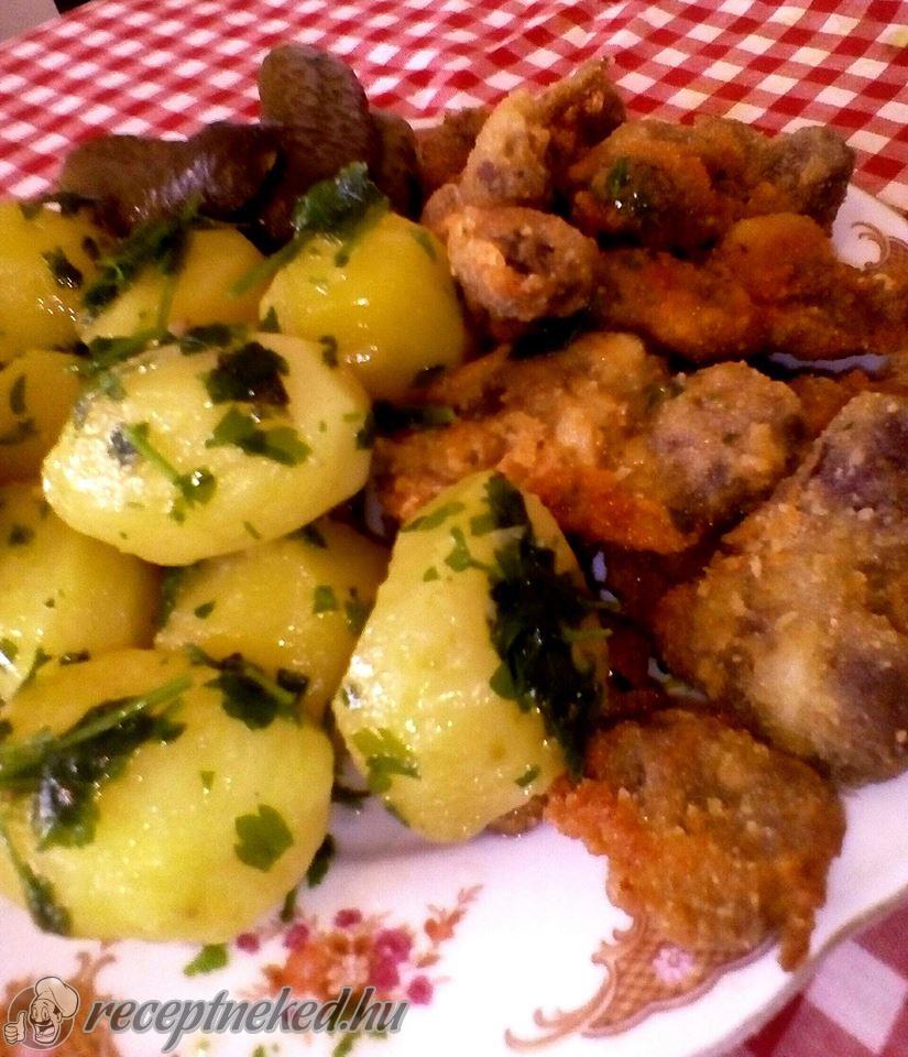 A rántott zúzát a burgonya mellé tesszük és savanyúsággal kínáljuk.
