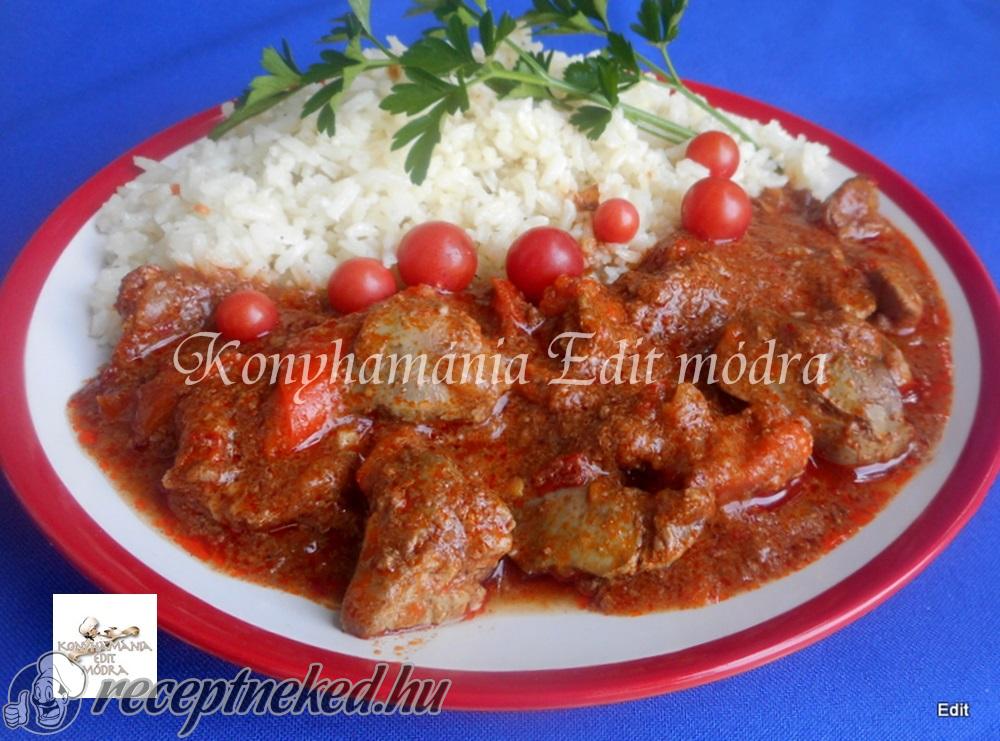 Ezután beletesszük a csíkokra vágott csirkemájat, felöntjük kb 1 dl forró vízzel és fedő alatt pároljuk.