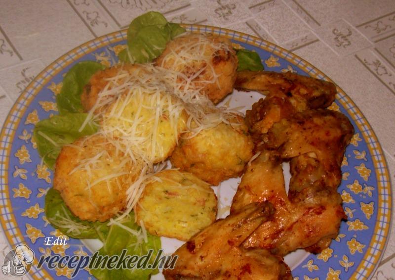 A ropogós csirkeszárnyakat a sajtos-sonkás rizsgolyókkal tálaljuk.