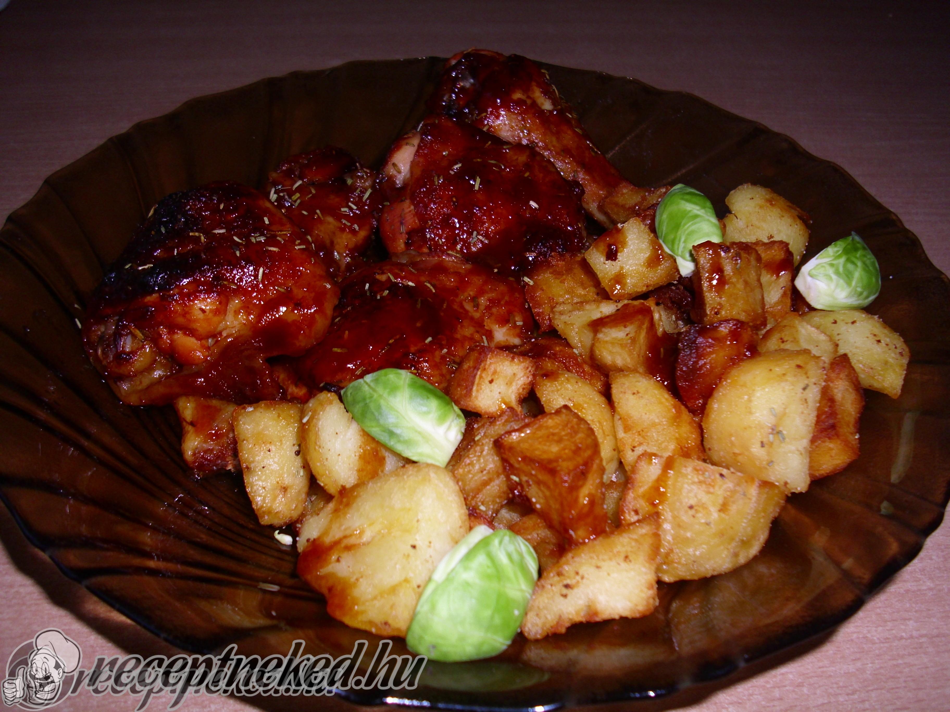 Egyenként beleforgatjuk a csirkecombokat, majd egy sütőtálba téve kb. 1 dl vizet öntünk alá, lefedjük fóliával, és a combok nagyságától függően 45-50 percig sütjük. Ezután a fóliát levesszük, kicsit feljebb vesszük a lángot, és hagyjuk a húst pirulni, ez idő alatt a megmaradt szószos szaft is szépen besűrűsödik.