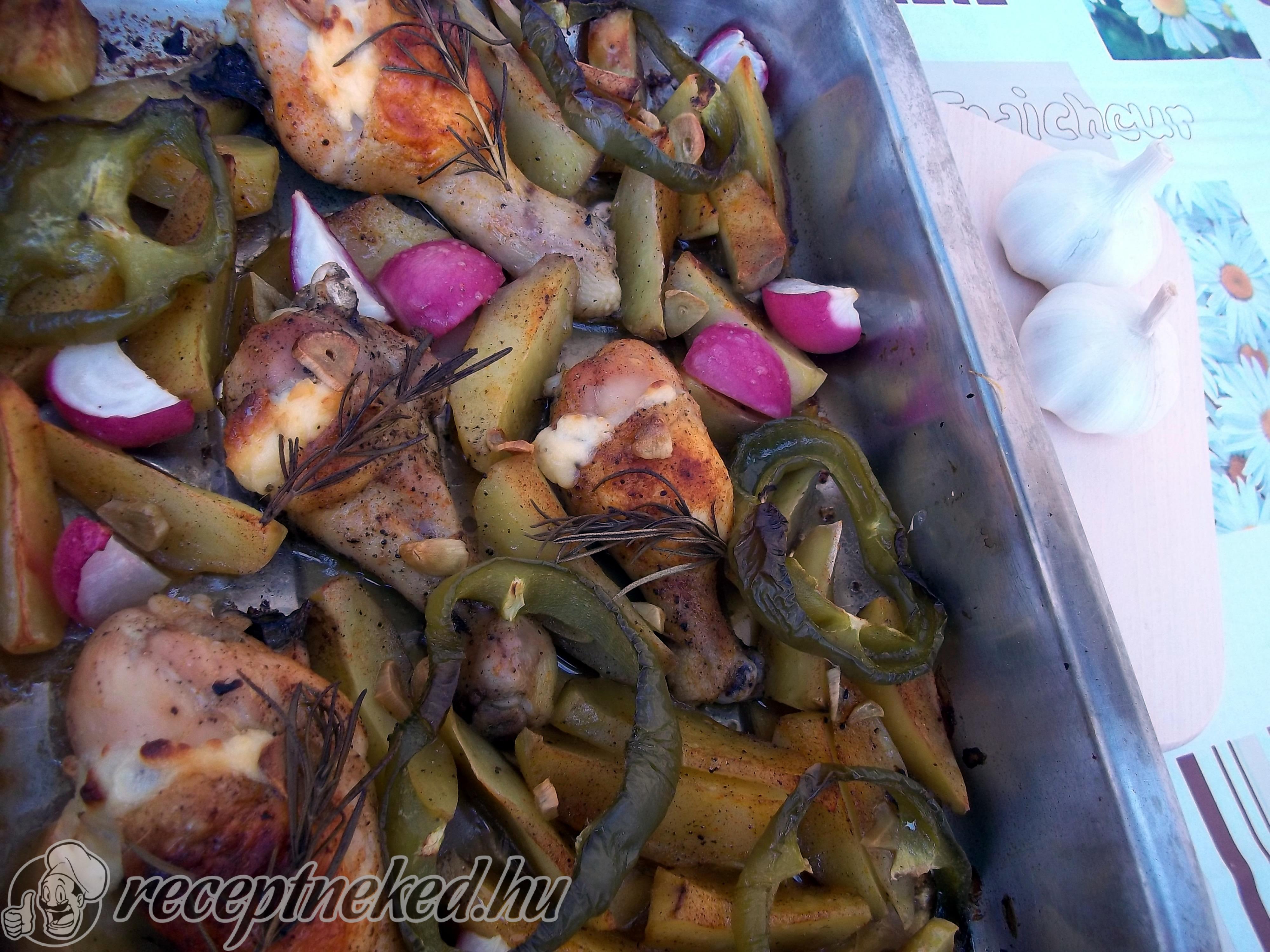 Tegyük a húst egy kiolajozott tepsibe, rendezzük köré a burgonyát, a retket,tegyük rá a paprika karikákat is. Sózzuk, borsozzuk, majd a combok tetejére rakjuk a fokhagyma szeleteket és a rozmaring ágat, majd előmelegített sütőbe toljuk.