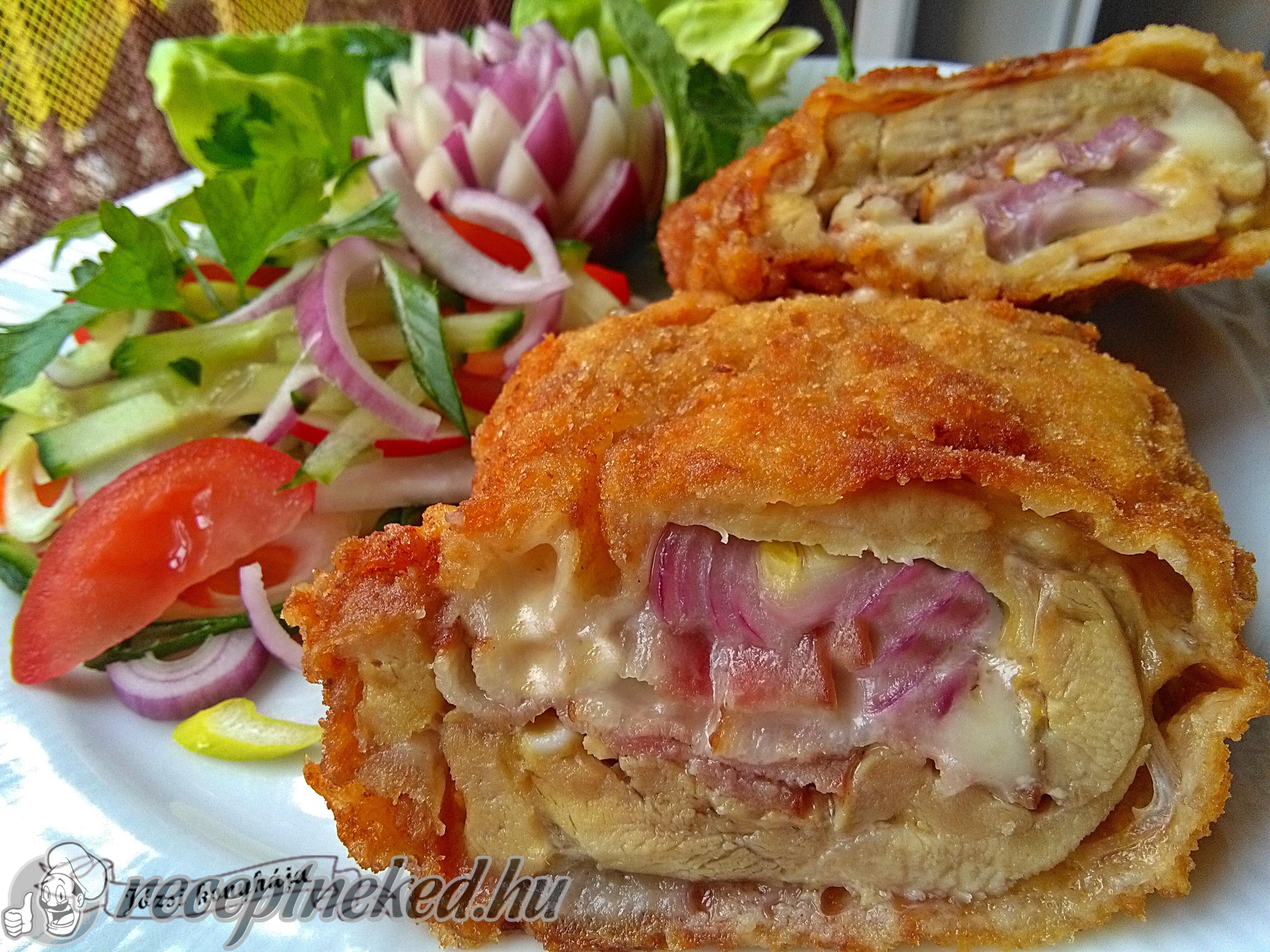 A hús másik oldalát ráhajtjuk majd a combokat a szokásos módon bepanírozzuk. Olajban közepes lángon kisütjük.