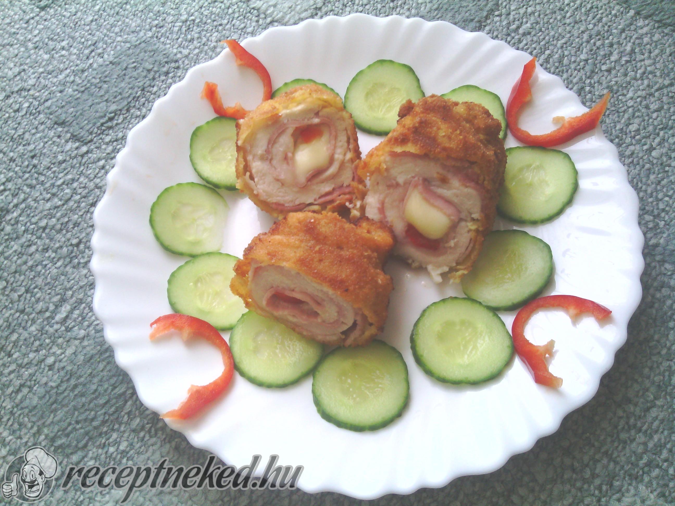 A csirkemellet megmossuk, a vizet leitatjuk róla és szeletekre vágjuk. Egy kicsit kiklopfoljuk, fűszerezzük. Egy szelet húsra ráfektetünk egy szelet csirkemell sonkát, egy darab sajtot és egy szelet kápia paprikát, majd feltekerjük. Hústűvel megtűzzük és bepanírozzuk: lisztbe, majd felvert tojásba, végül zsemlemorzsába forgatjuk. Bő, forró olajban kisütjük.