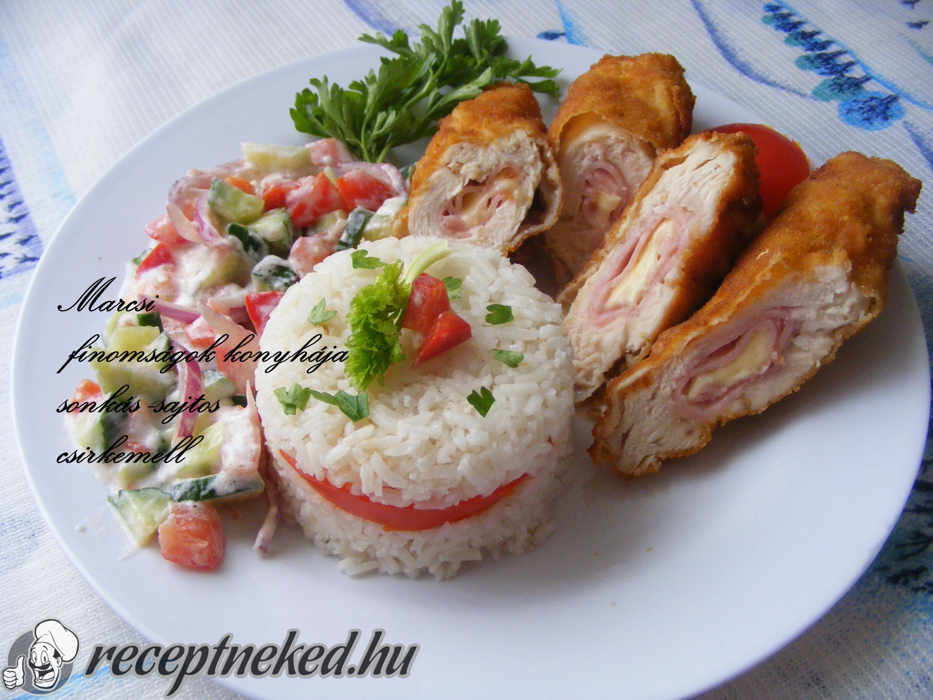 A tepsi alját megszórjuk reszelt sajttal. A hússzeleteket először a zablisztbe, majd a tejfölös tojásba forgatjuk, és a tepsibe fektetjük. Megszórjuk reszelt sajttal és befedjük csirkemell sonkával. Ezt a rétegezést még egyszer megismételjük, végül a sonkaszeletekre öntjük a maradék tojásos keveréket.