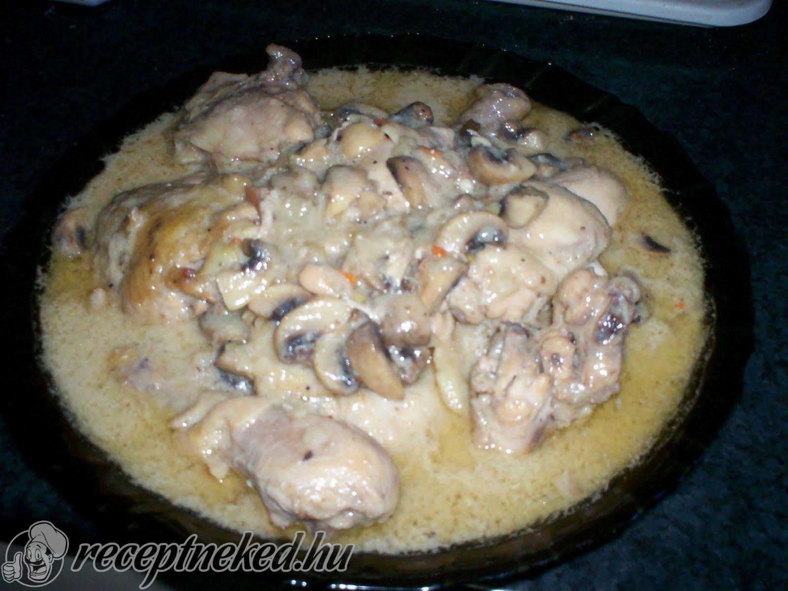 A gombát alaposan megmossuk, feldaraboljuk, majd a puha hús mellé tesszük, és pár percig együtt főzzük. Közben a tejszínből és a lisztből habarást készítünk. A húsokat kiszedjük a lábosból, a szaftot simára keverjük a habarással, majd összeforraljuk. Visszatesszük a húsdarabokat, és még egy percig főzzük. Ezután levesszük a tűzről, és már tálalhatjuk is.