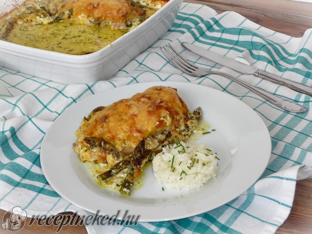 Egy sütőtálba belehelyezzük az elősütött csirkemelleket, majd köré helyezzük a megtisztított, feldarabolt spárgát. Ezután óvatosan ráöntjük a tejszínes-hagymás szószt, majd alufóliával lefedjük.