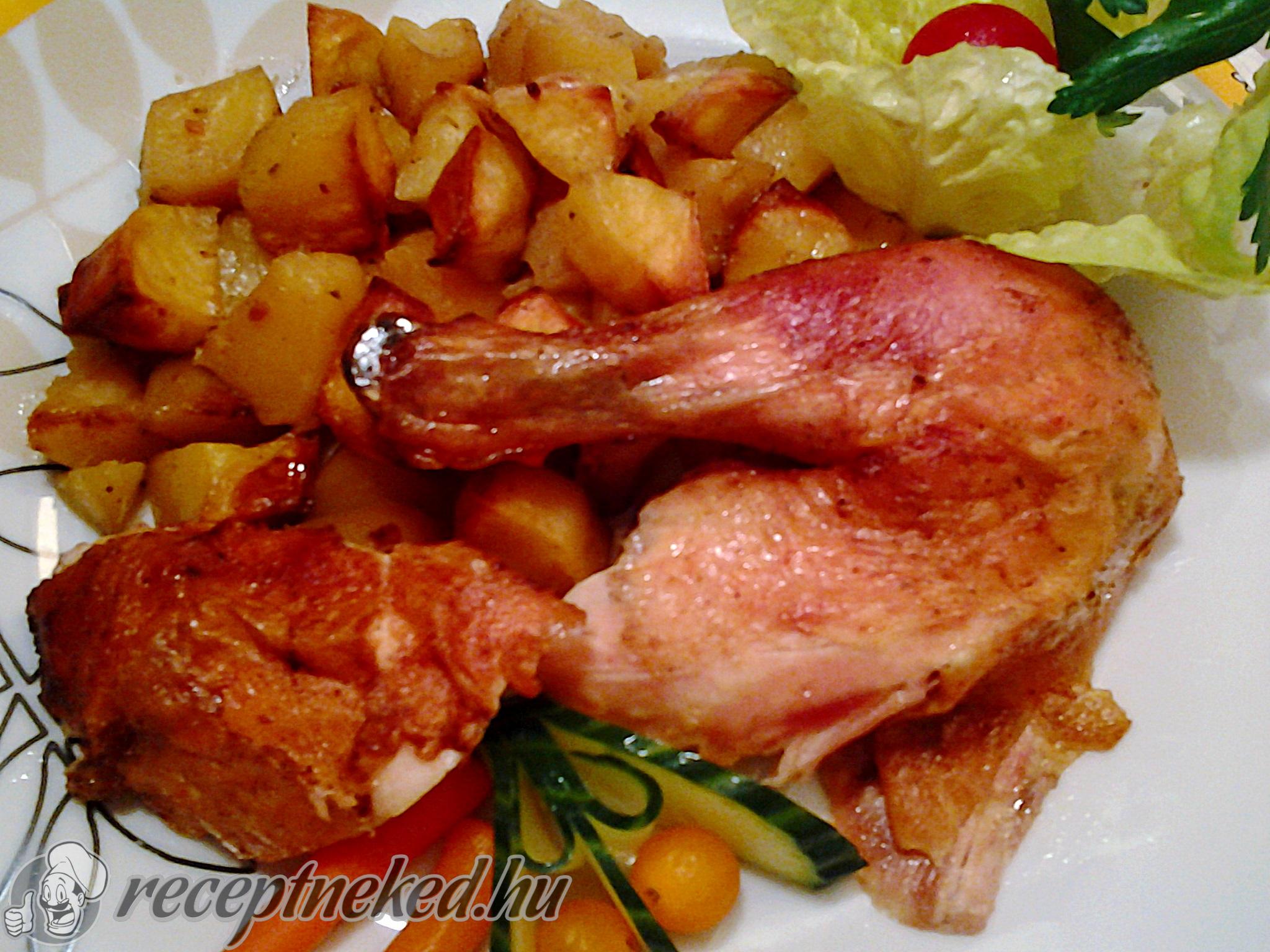 Alufóliával letakarjuk és előmelegített, 200 fokos sütőbe toljuk 60 percre, majd levesszük a fóliát és a legnagyobb fokozaton megpirítjuk.