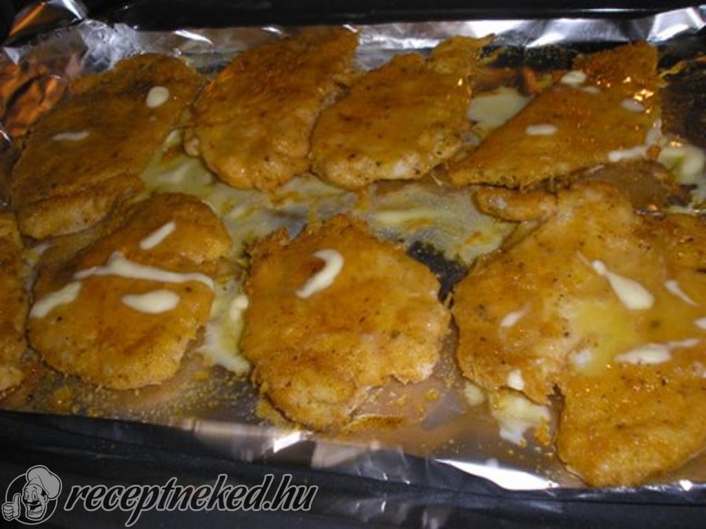 A vágott bazsalikomot, petrezselymet, a csilit, és a sajtot, no meg a fokhagymát belereszeljük. Az egészet jó alaposan összekeverjük. A tepsiben lévő fóliát olajjal meglocsoljuk, és a hússzeleteket először a tojásba, majd a fűszeres morzsába beleforgatjuk, kézzel megnyomkodjuk azért, hogy megtapadjon rajta a panír, majd sorban a kiolajozott tepsibe rakjuk őket.