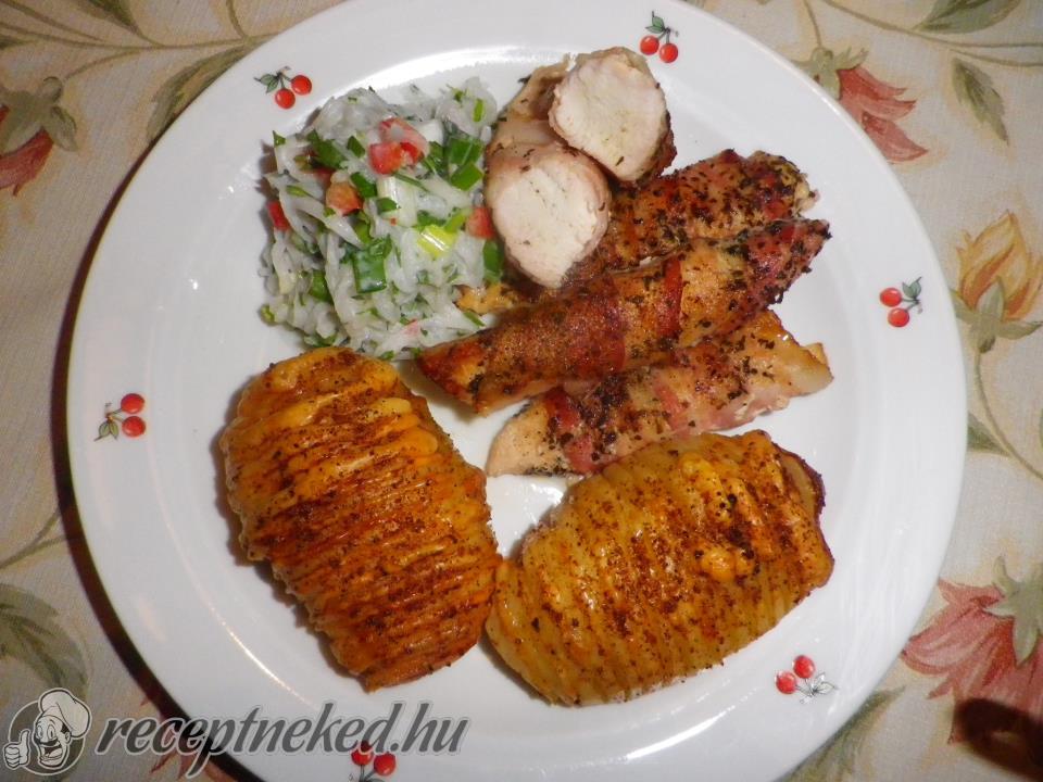 A megtisztított burgonyát sűrűn bevagdossuk, ügyelve arra, hogy ne vágjuk át teljesen. Az aljára egy kis „talpat” vágunk, hogy stabilan álljon. Minden bevágásba teszünk egy szelet sajtot. A maradék fűszerkeverékhez hozzáadjuk a pirospaprikát, és megszórjuk vele a burgonyákat. A kiolajozott tepsiben a hús mellé helyezzük őket, és együtt sütjük készre.