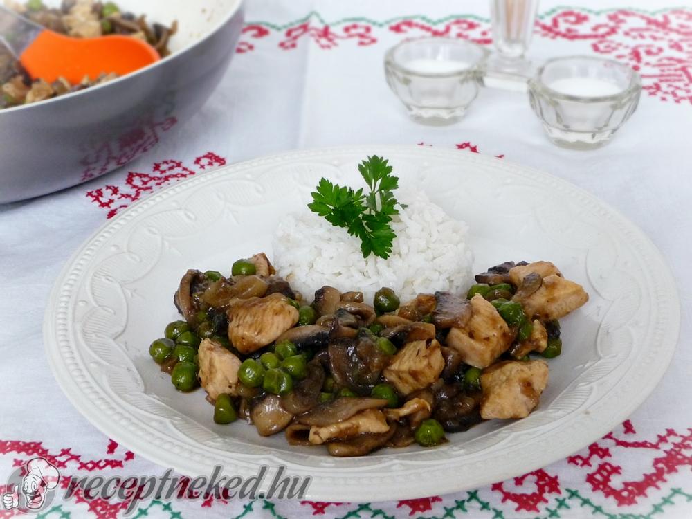 A visszamaradt zsiradékba tegyük bele a vékonyra felszeletelt újhagymát, majd pároljuk pár percig, és akkor adjuk hozzá az apróra felvágott fokhagymát is. Ezután adjuk hozzá a gombát, ízlés szerint sózzuk, és pároljuk pár percig, majd adjuk hozzá a zöldborsót, és szórjuk meg a barna cukorral. Pár perc alatt pároljuk puhára, majd tegyük bele az elősütött csirkemellet és keverjük össze.
