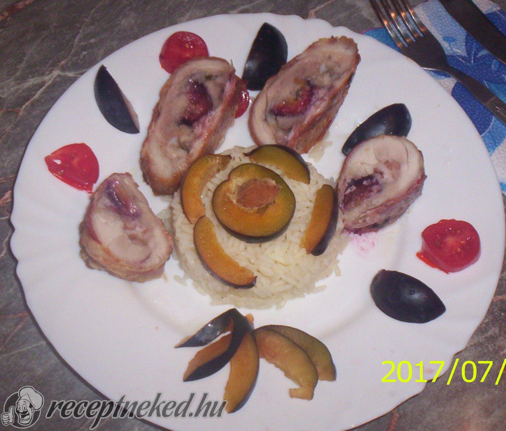 A szalonnákat kettesével kiterítjük egy vágódeszkán, majd a sózott, borsozott combokat rátesszük. Minden comb közepébe teszünk két hasáb sajtot és egy szilvát. A szalonna segítségével feltekerjük és hústűvel vagy fogvájóval összetűzzük.