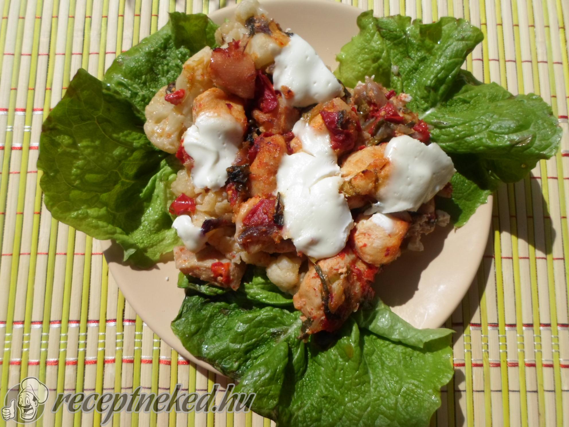 Amikor a hús félig megpuhult, hozzáadjuk a felkarikázott újhagymát zöldjével együtt és a felaprított pritamin paprikát.