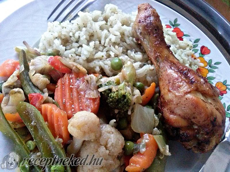 - 1 kg távolkeleti zöldségkeverék (akár mirelit is) (zsenge mungóbab csíra, kandírozott gyömbér, répa, póréhagyma, zsenge hüvelyes zöldborsó, káposzta, karfiol, brokkoli, bambuszrügy, paprika, fafül gomba, csiperke gomba, stb bármi, ami zöldség és egészséges)
