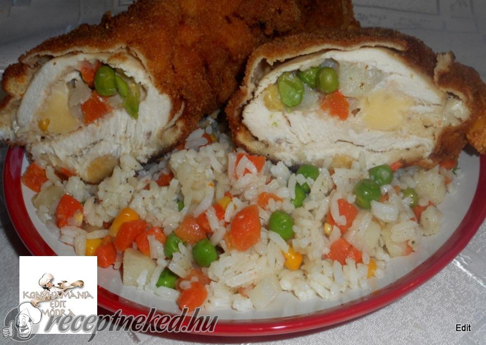 Bedörzsöljük a fűszerkeverékkel mindkét oldalát, majd az egyik felére teszünk a főtt zöldségekből és megszórjuk reszelt sajttal és ráhajtjuk a másik felét.