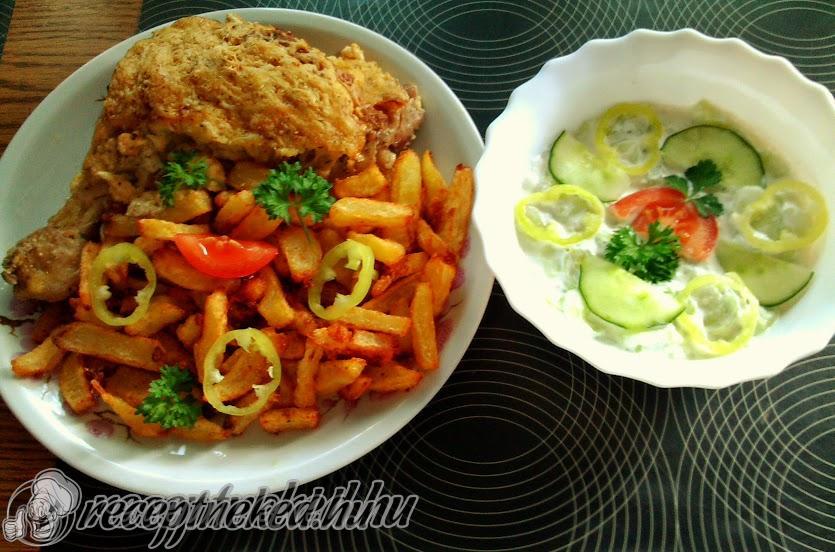 Sütés közben a tejből egy finom, fűszeres szaft lesz. Ízlés szerint készítsünk hozzá köretet és savanyúsággal,vagy bármilyen salátával tálaljuk. Nagyon ízletes étel, okvetlenül próbáljátok ki! 🙂