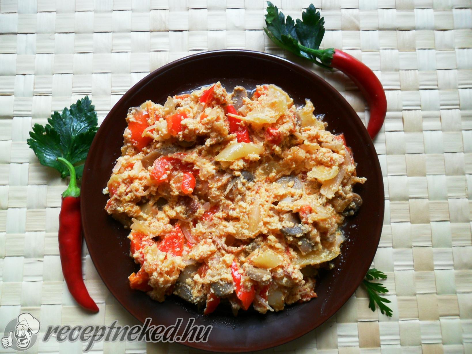 A vöröshagymát és a fokhagymát pucoljuk meg, majd vágjuk fel apróra. A gombát vékonyan szeleteljük fel.
