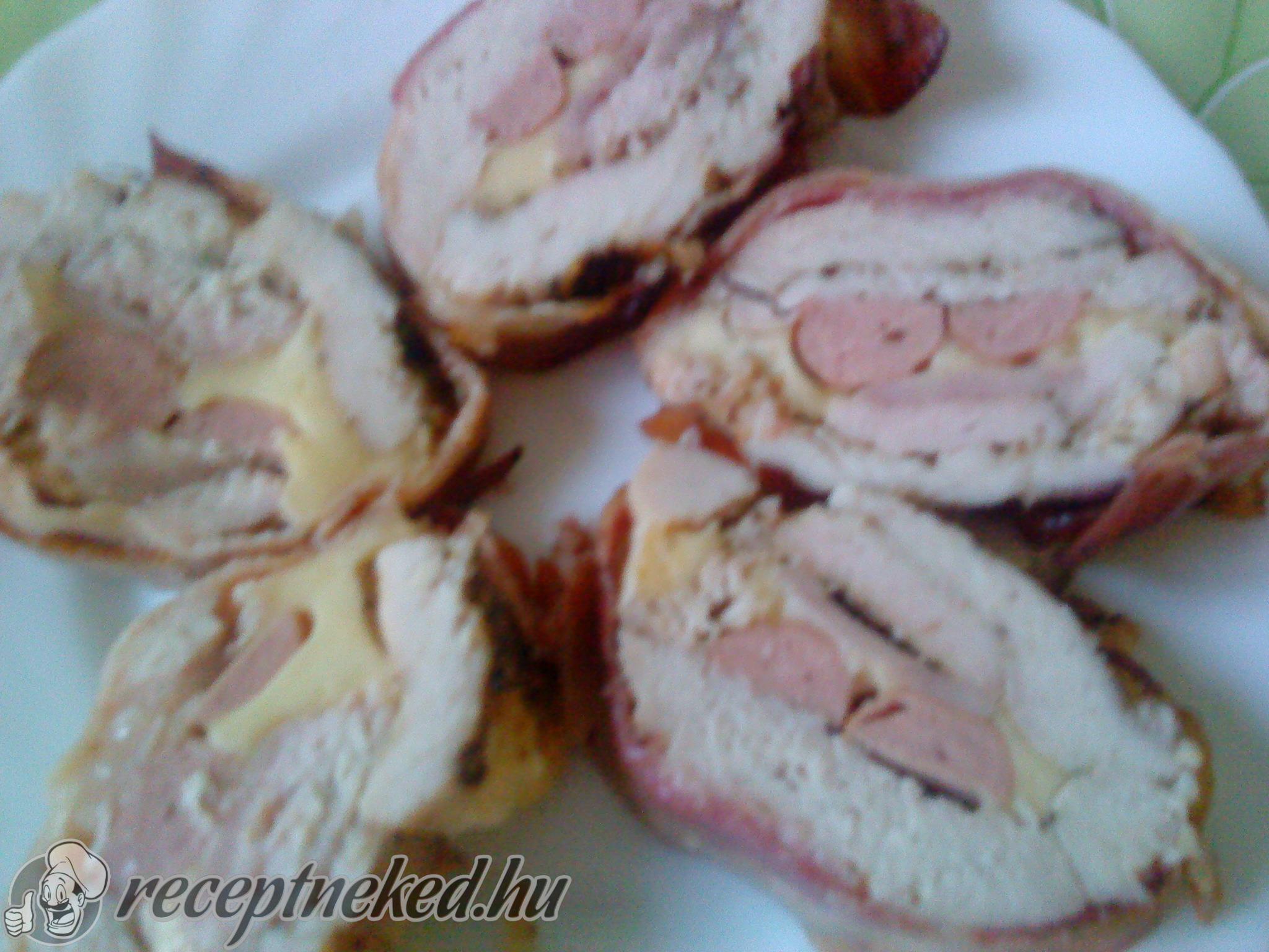 Bacon szeleteket raktam egymás mellé szorosan, majd erre ráfektettem a húst. Megkentem a mascarponés-fetás krémmel, majd friss spenót leveleket helyeztem rá. Szorosan feltekertem, folpackba csomagoltam és betettem a hűtőbe pihenni.
