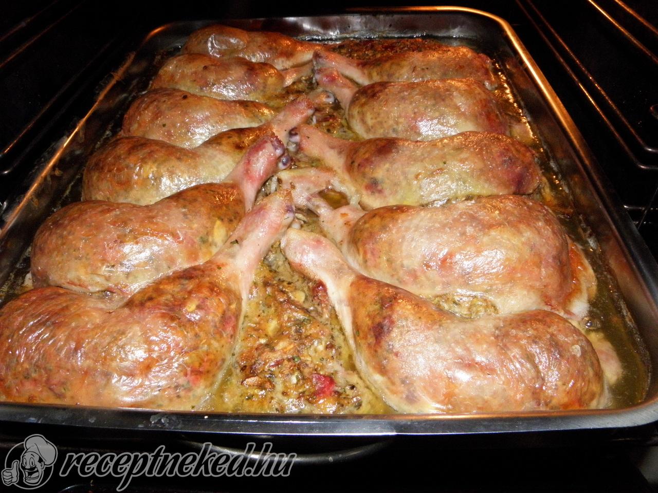 200 fokos sütőben 50-60 percet süssük. A végén kicsit rápiríthatunk, hogy szép piros legyen a teteje. Sülés közben a kisült zsírjával egyszer-kétszer locsoljuk meg.