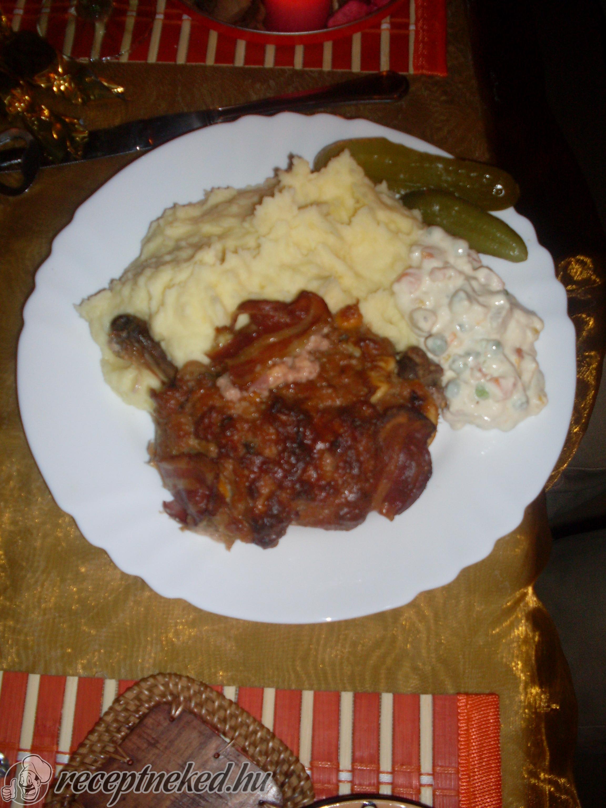 Krumplipürével és savanyú uborkával tálalom., de jól illik hozzá a franciasaláta is.