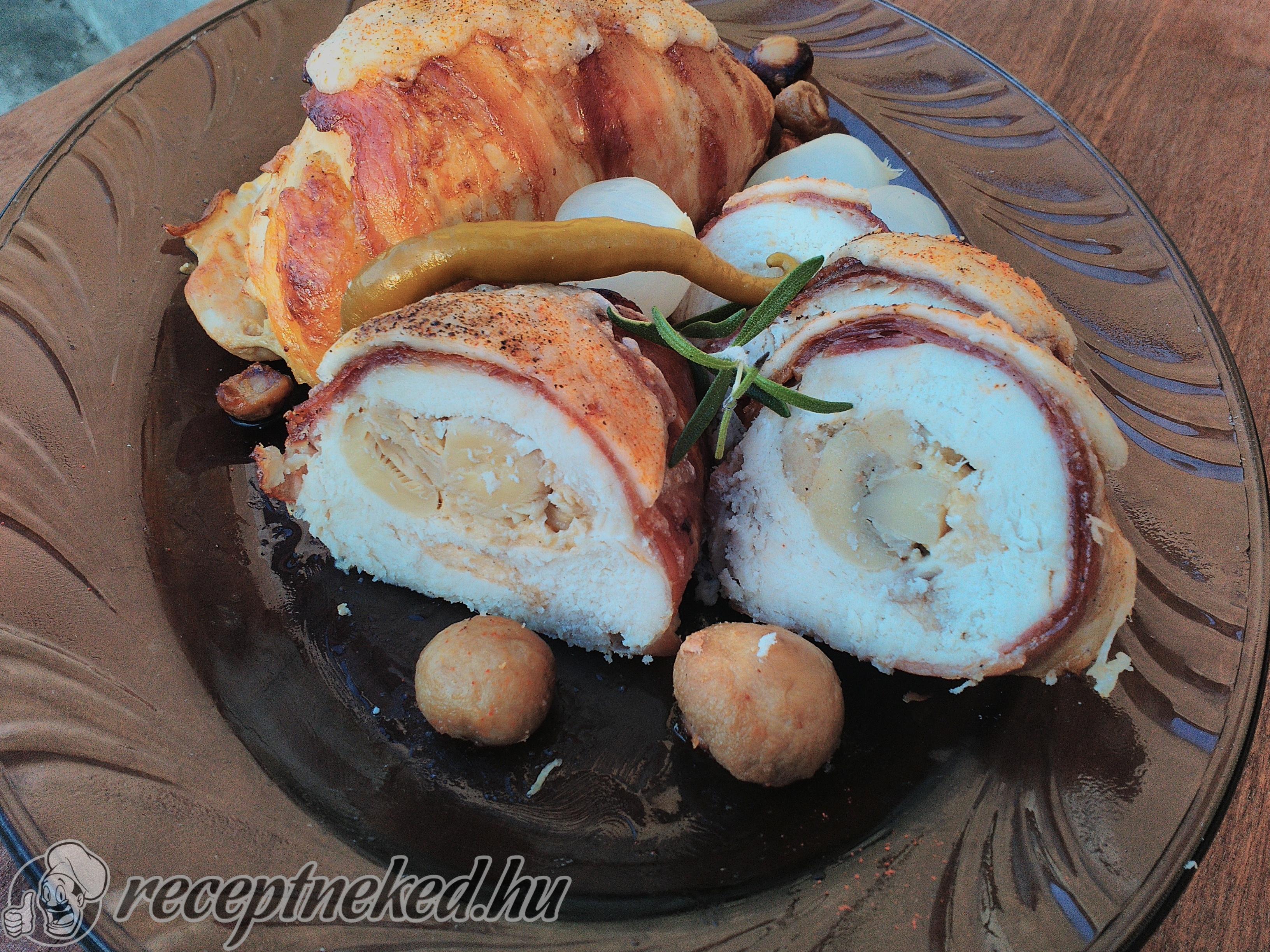 A megtöltött csirkemellet baconbe göngyöljük és kivajazott tepsibe tesszük.