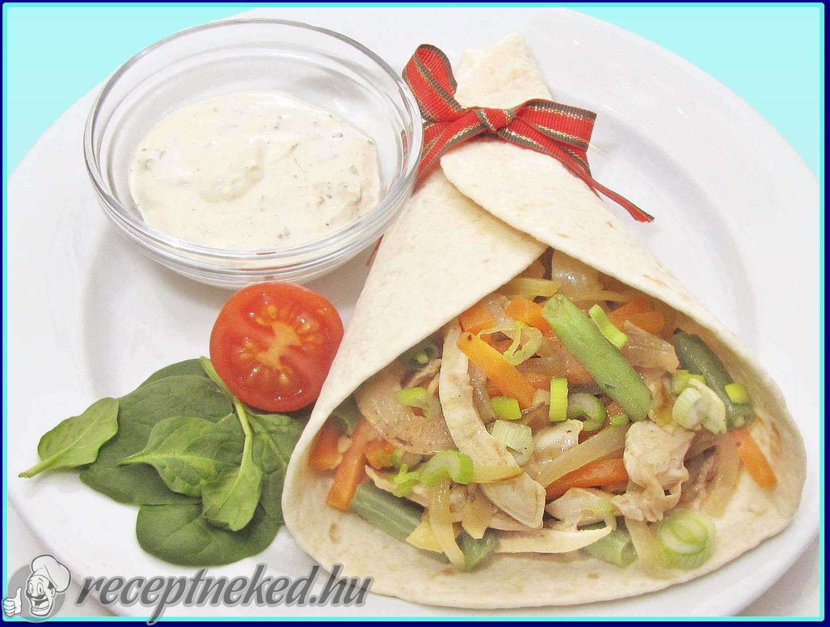 Ezt a ragut tesszük a tortillába. Akár tekercs formájában, akár úgy, hogy tölcsért formázunk belőle, vagy csak egyszerűen a tortilla lap felére ráhalmozott ragura ráhajtjuk a lap másik felét.