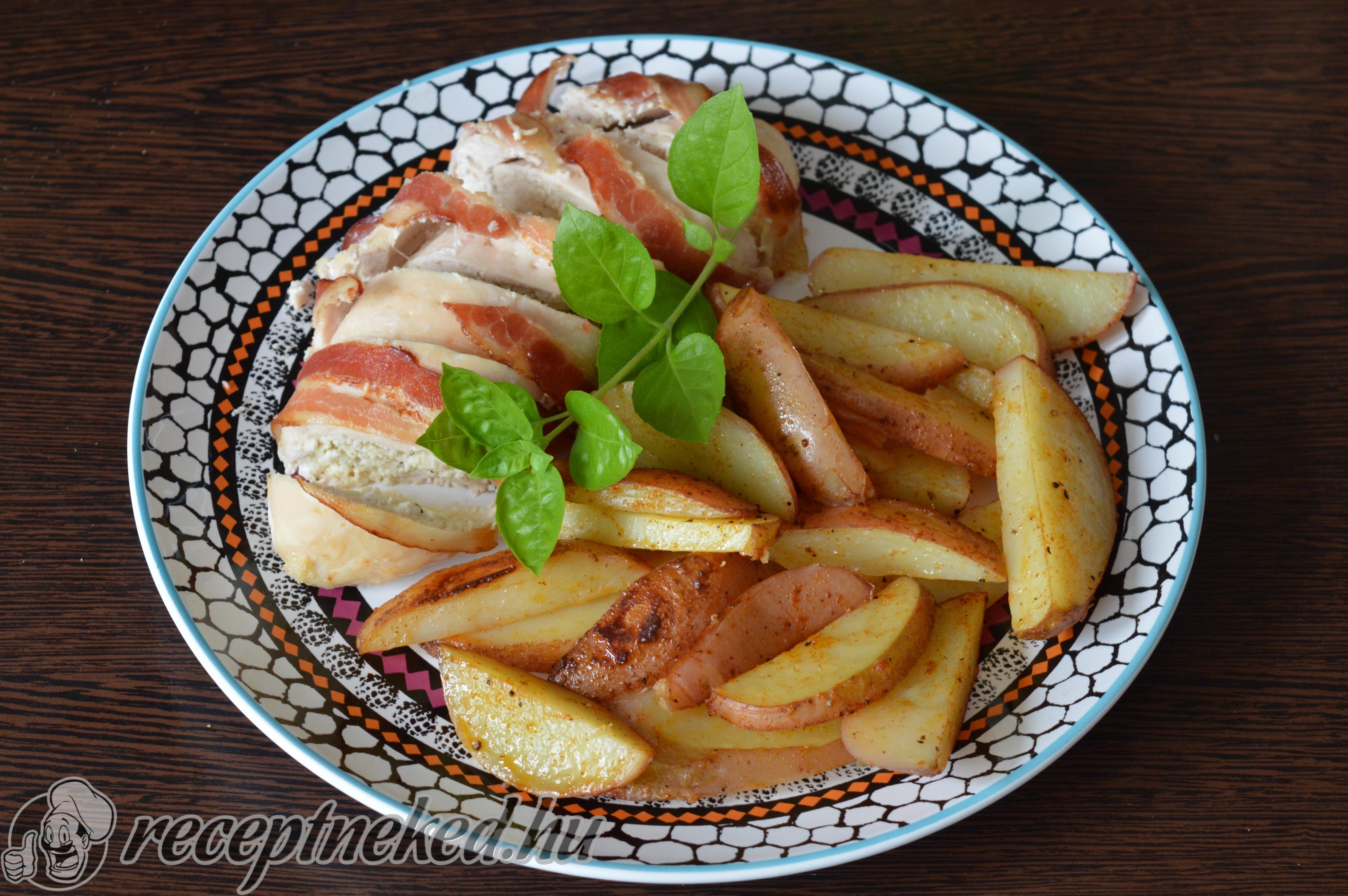 A csirkemelleket kiterítjük, megkenjük a krémsajttal, rákenjük a túrós masszát, majd felgöngyöljük. A baconnel körbefogjuk a csirkemelleket, tepsibe rakjuk őket, és kb. 1 dl vizet öntünk alá. A bacon összefogja annyira a húst, hogy további összetűzésre nincs szükség, és a krém sem fog sülés közben kifolyni belőle.