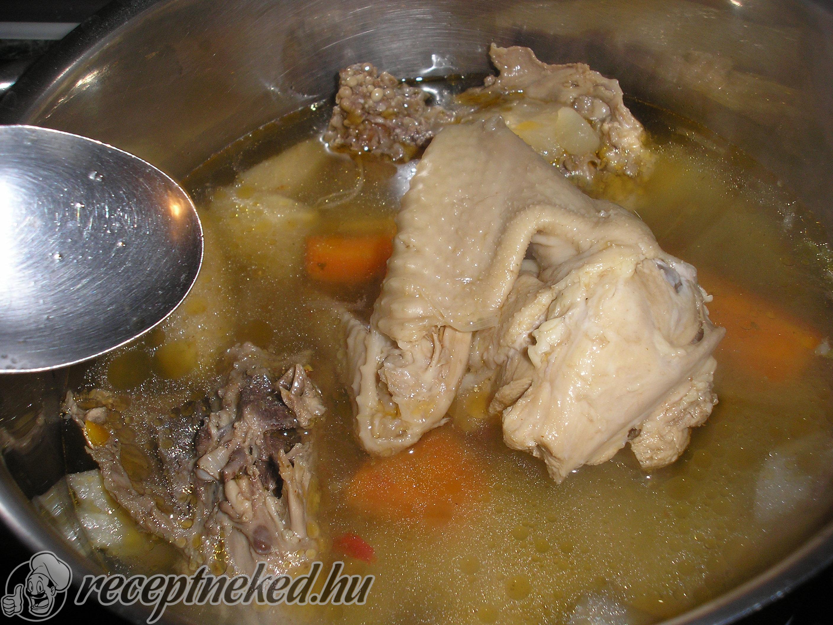 Mikor felforrt, leszedjük a tetejéről a habot. A zöldségeket meghámozzuk és a leveshez adjuk.