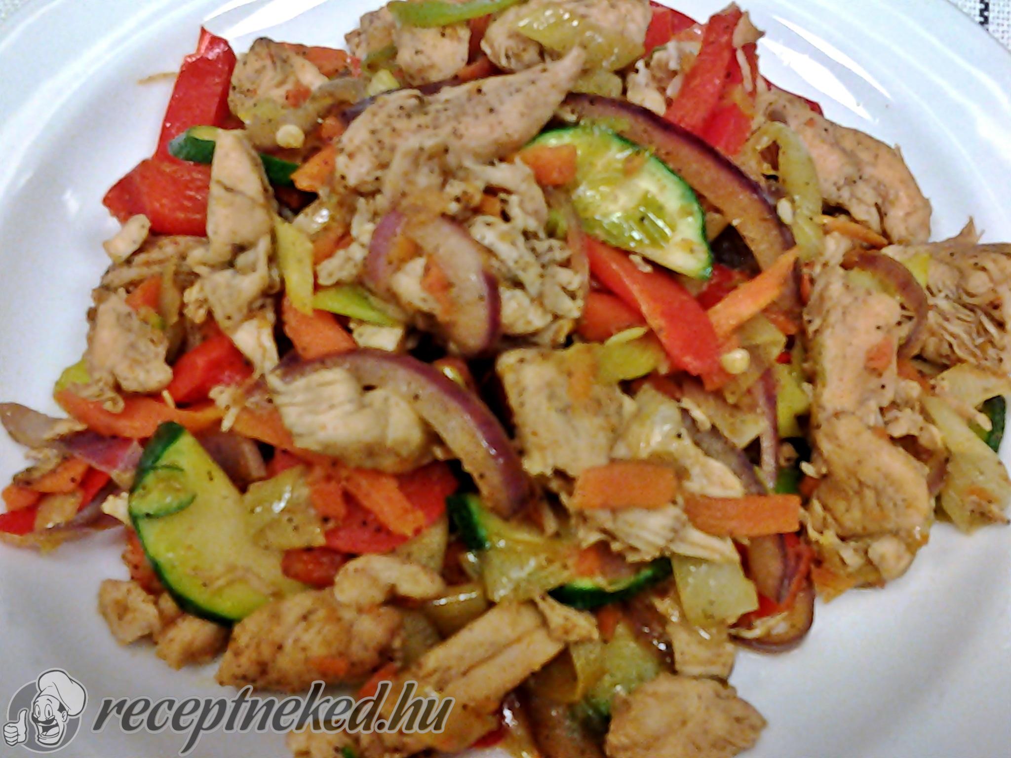A csirkemell csíkokat wokban vagy serpenyőben kevés forró olajon megpirítjuk, hozzáadjuk először a sárgarépát, majd a paprikát, póréhagymát, lila hagymát, végül a cukkinit.
