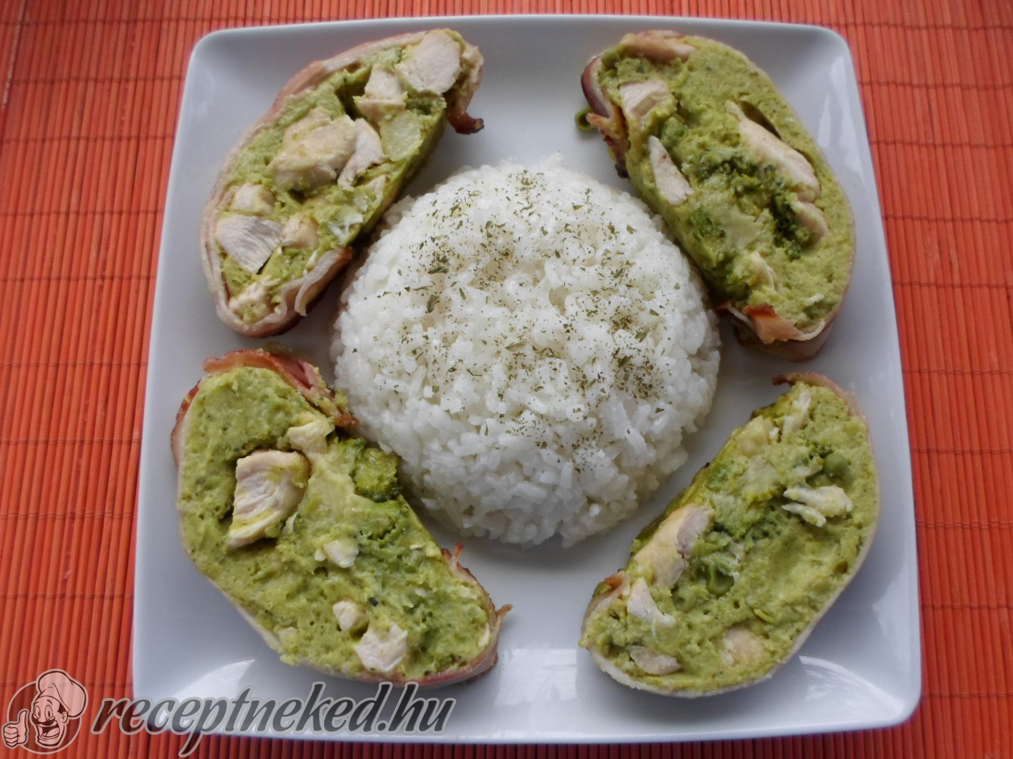 Őzgerinc formát kibéleljük a bacon szalonnával, beletesszük a zöldséges húst, ráhajtjuk a lelógó szalonnát, és készre sütjük.