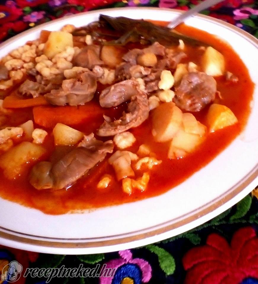Mikor a zúza puha belerakom a kis kockára vágott burgonyát. Közben elkészítem a nokedlit a tojásból és lisztből. Mikor a burgonya majdnem puha, akkor szaggatom bele a nokedlit.