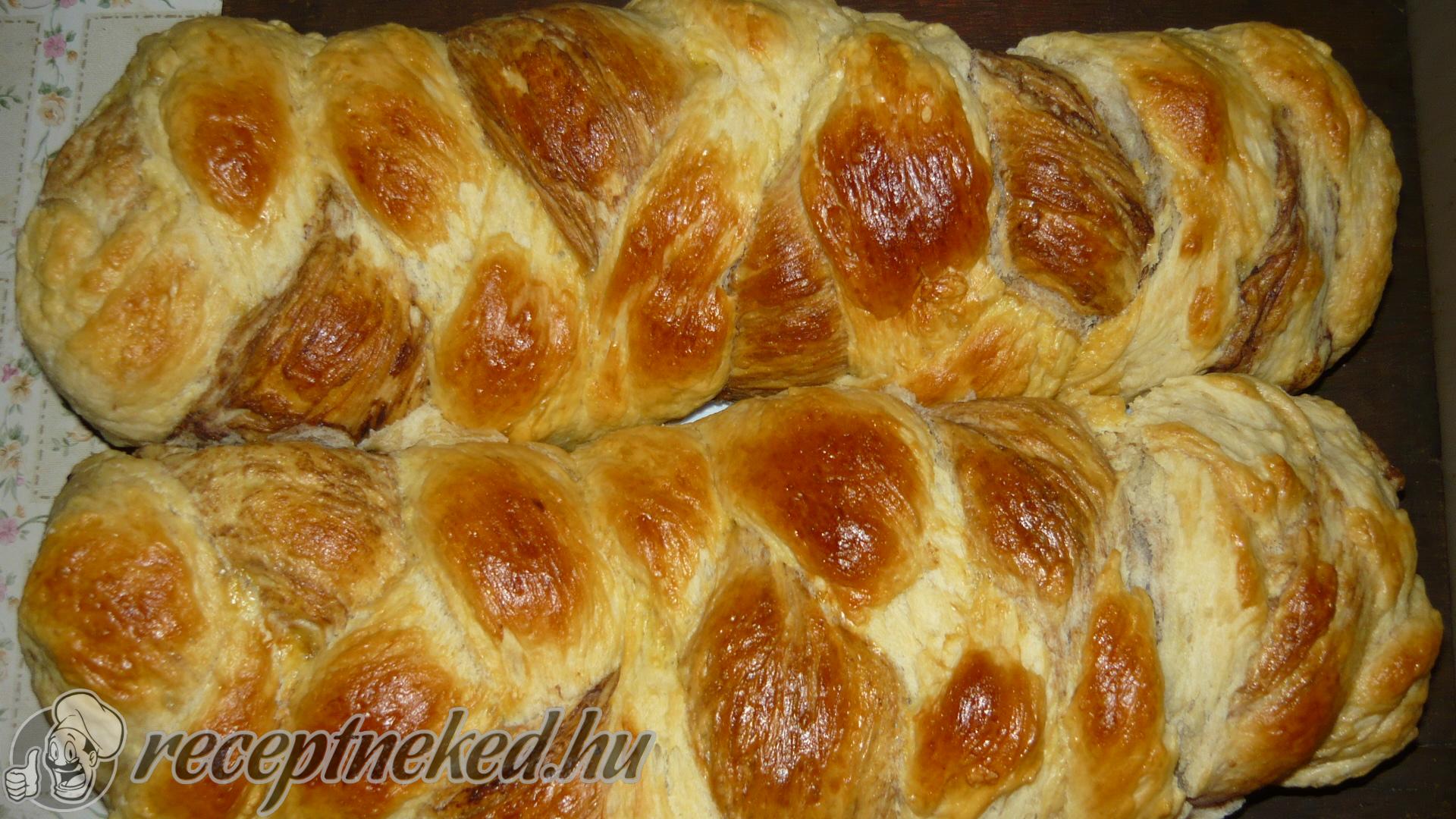 Az első kalácshoz két fehér és egy kakaós rudat összefonunk. Ugyanezt megismételjük a maradék tésztával, így két kalácsot kapunk.