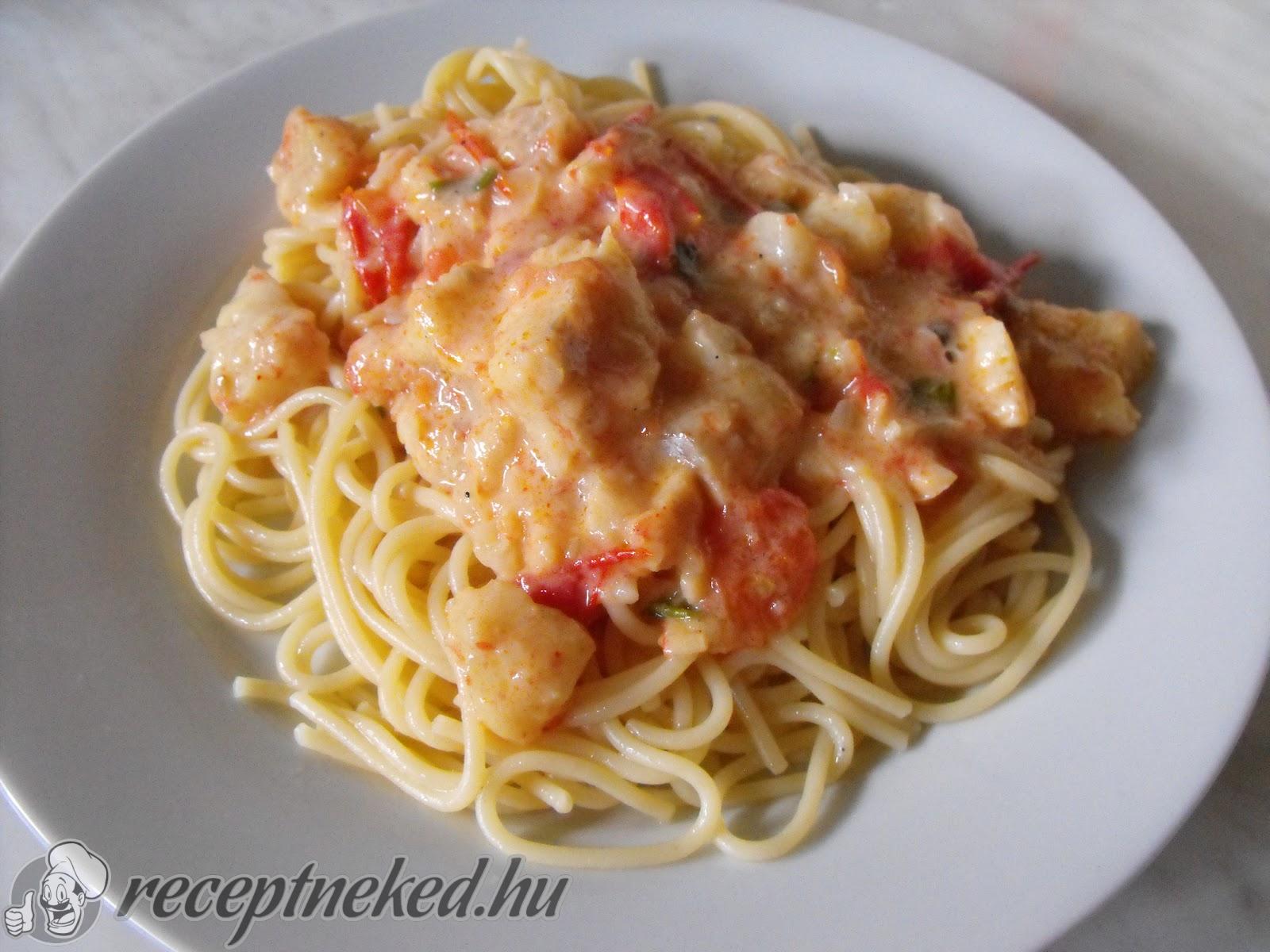 Amikor a hal megpuhult, tejszínt öntök rá és 3-4 percig forralom. Sós vízben kifőtt tésztával tálalom.