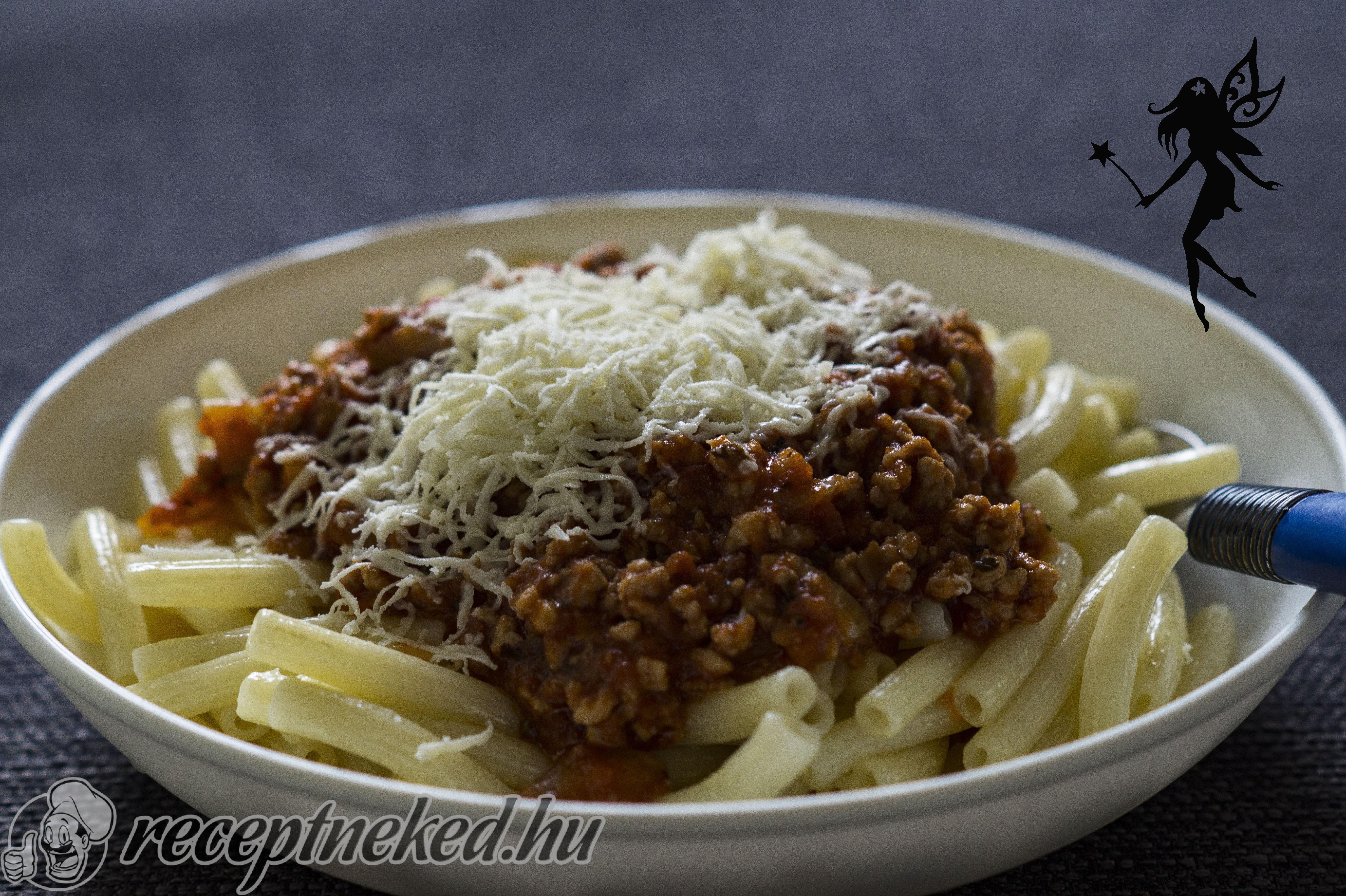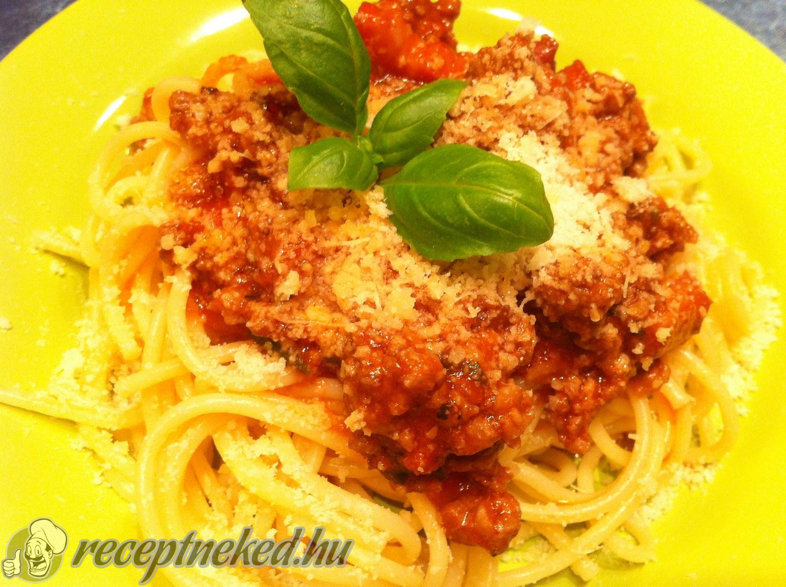 A hagymát nagyon apróra vágjuk és forró olajon megpirítjuk. Ezután hozzáadjuk a darált húst és összepirítjuk. A megpirult húsra rászórjuk a bolognai alapot, hozzáadjuk a sűrített paradicsomot, bazsalikomot, oregánót, majd kevés vízzel felöntjük. A víz adagolása ízlés szerint történik. Ameddig a hús fő, egyhén sós vízben kifőzzük a tésztát. A kész mártást a tésztával összekeverjük és tálaláskor sajttal megszórjuk a tetejét.