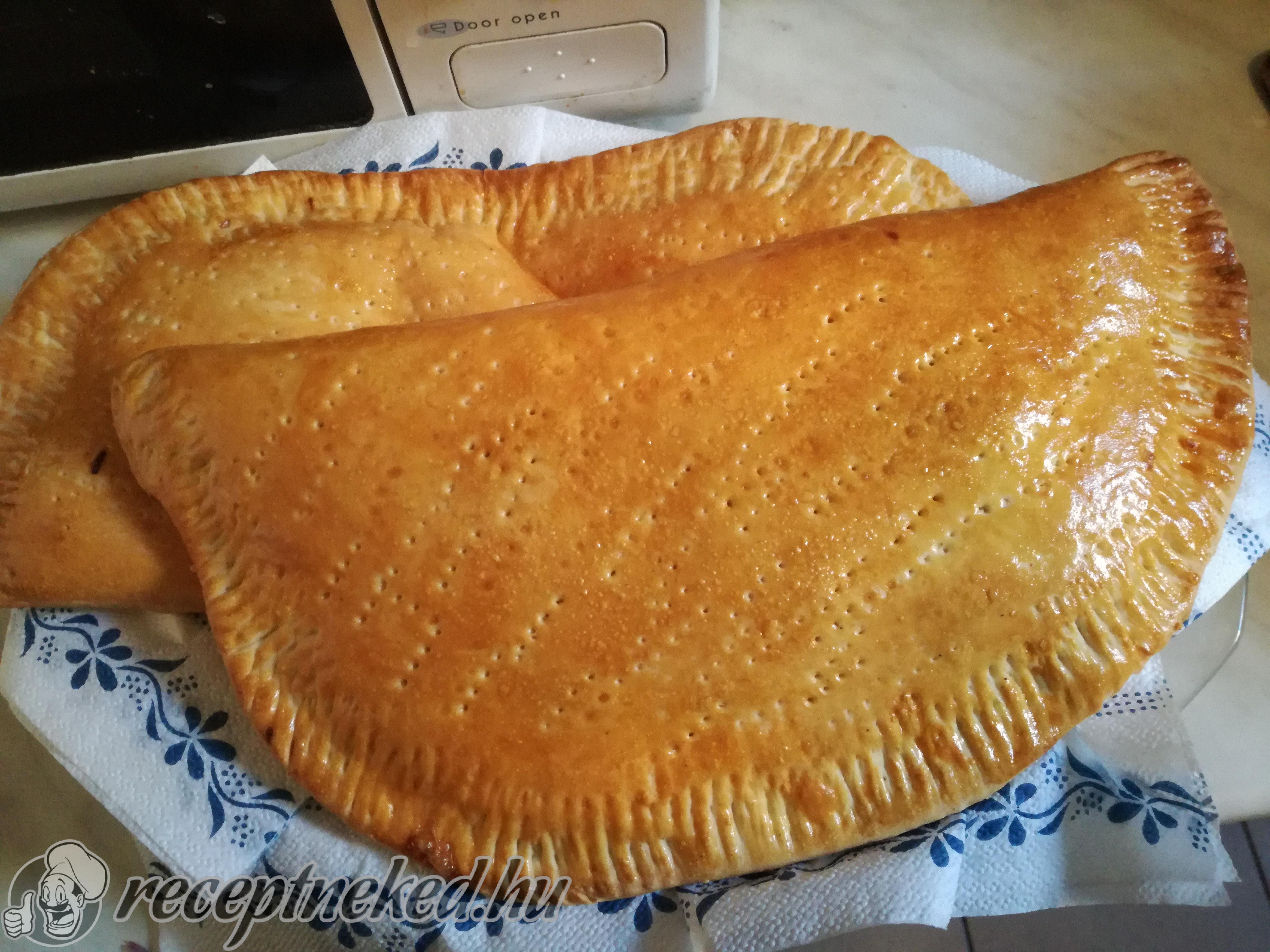 Megszórjuk a felét a feltéttel, ráhajtjuk a másik felét és egy villa segítségével szépen lezárjuk a széleit, lekenjük tojássárgájával, majd megszurkáljuk a tetejét.