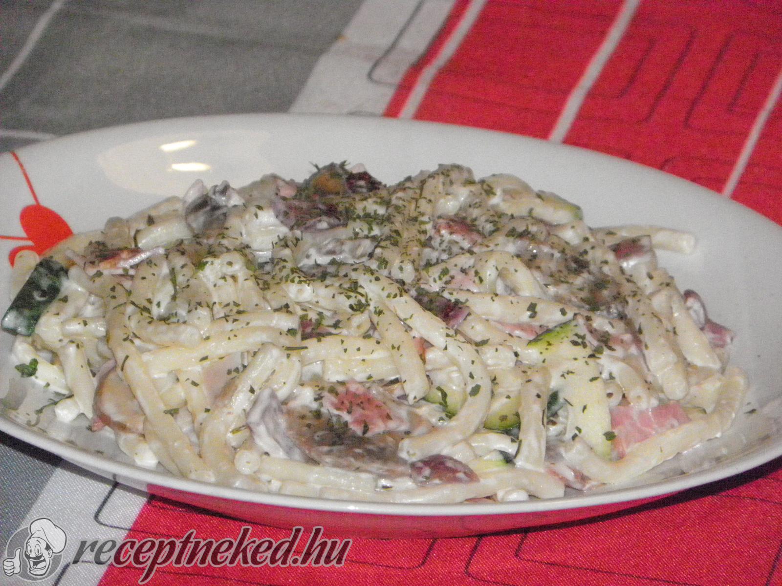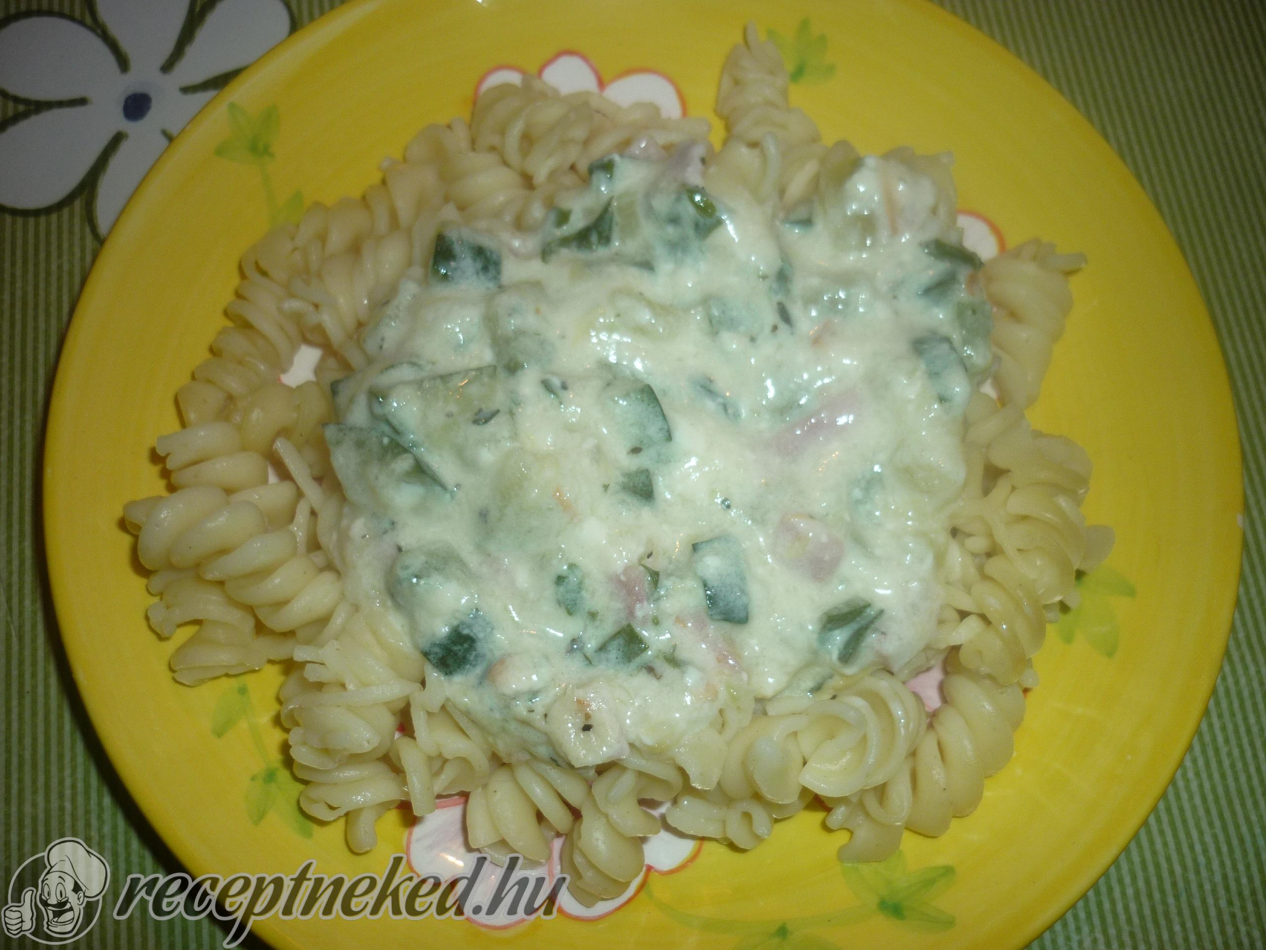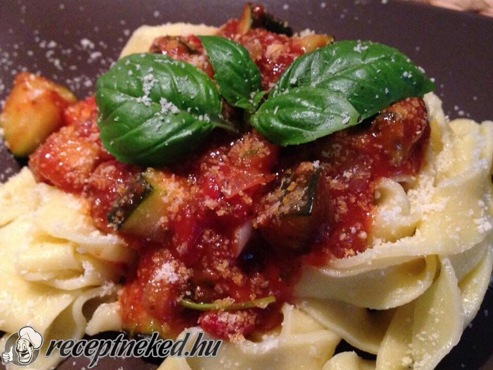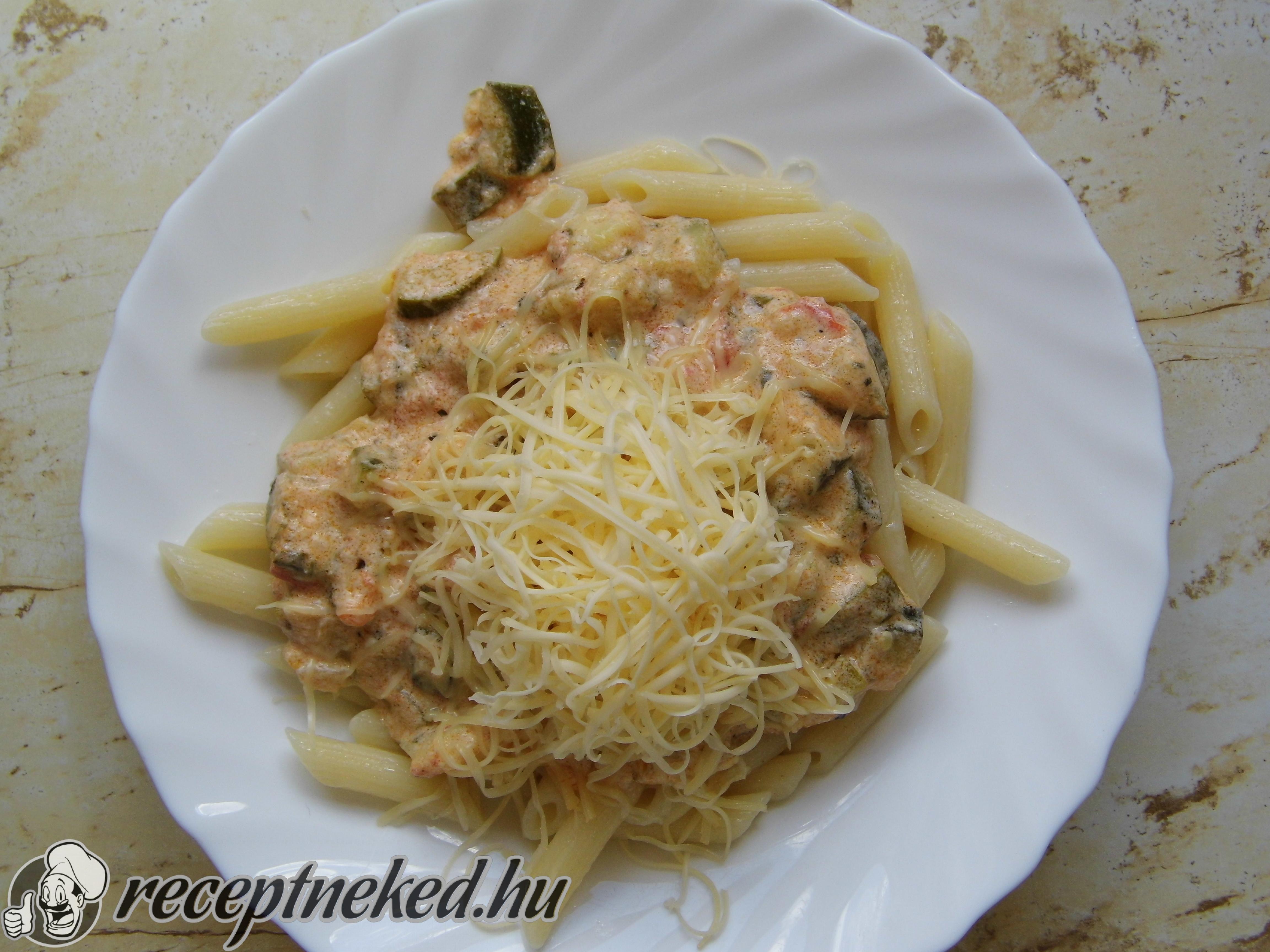 Az elkészült zöldségmártást összekeverjük a kifőzött tésztával. Tálaláskor megszórhatjuk reszelt sajttal is.
