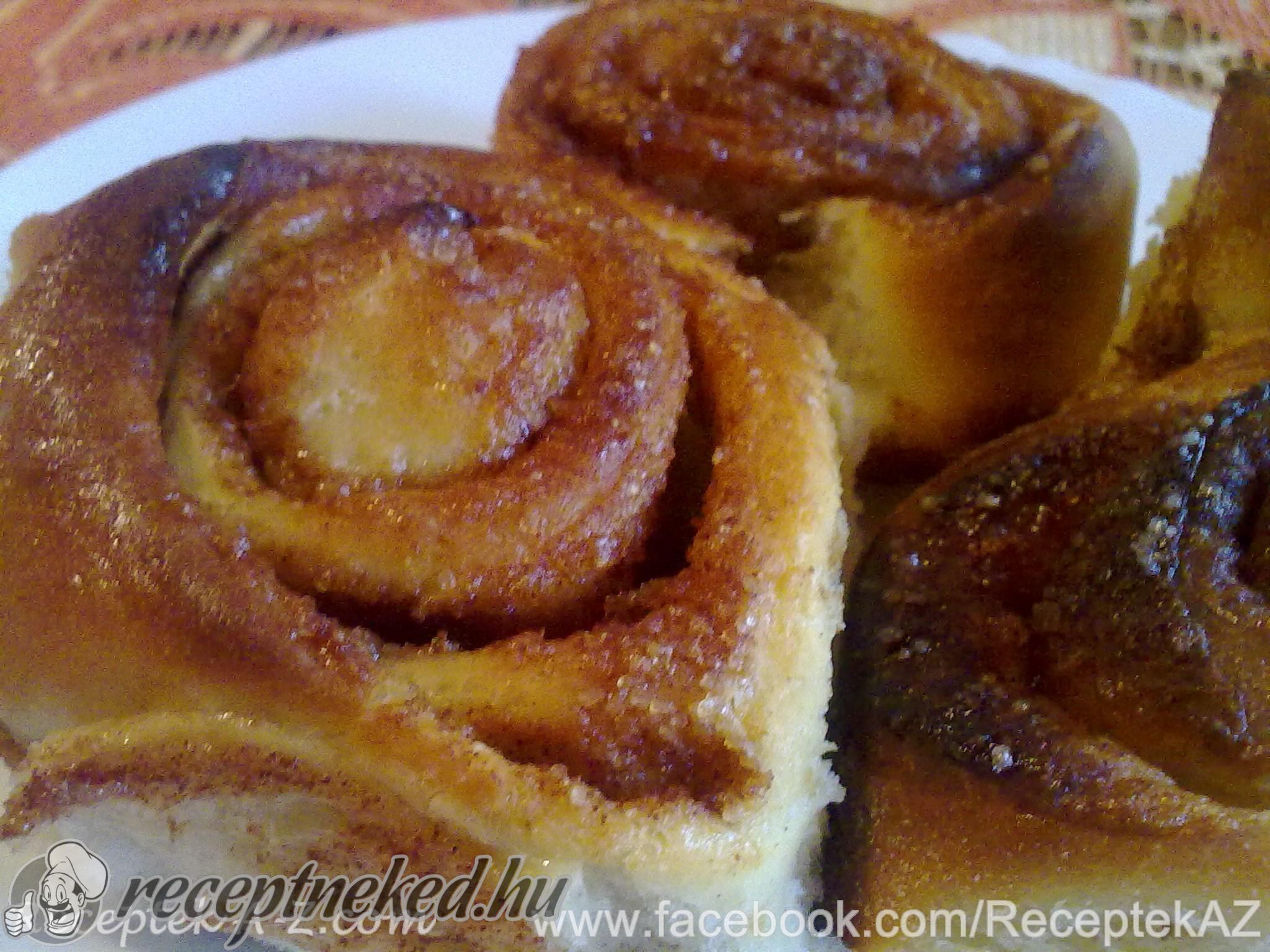 A töltelékhez a vajat felolvasztjuk, majd elkenjük a kinyújtott tésztán. A barna cukor és fahéj keverékével jól megszórjuk a tésztát, majd szorosan feltekerjük. Kb. 2 cm vastag szeletekre vágjuk, és egy sütőpapírral bélelt tepsibe rakjuk. A tepsiben még fél órát kelesztjük, majd előmelegített sütőben 180 fokon kb. 20 perc alatt megsütjük. Még forrón, ecset segítségével lekenjük a meleg vaníliás tejjel.