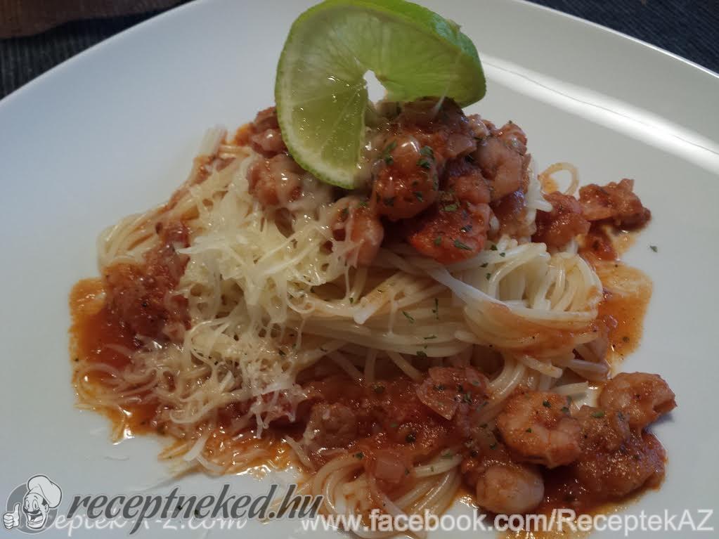 Tovább forraljuk enyhe tűzön még 5 percig. Ezalatt kifőzzük a tésztát. Tálaláskor a spagettire szedünk a garnélarákos szószból, és meghintjük reszelt sajttal.