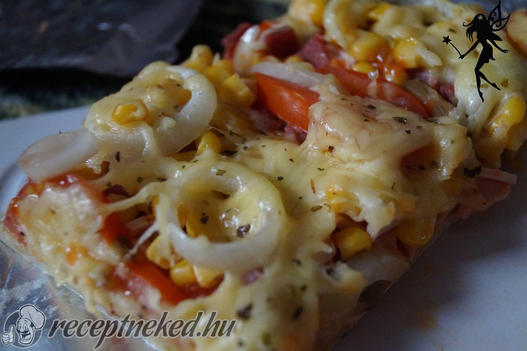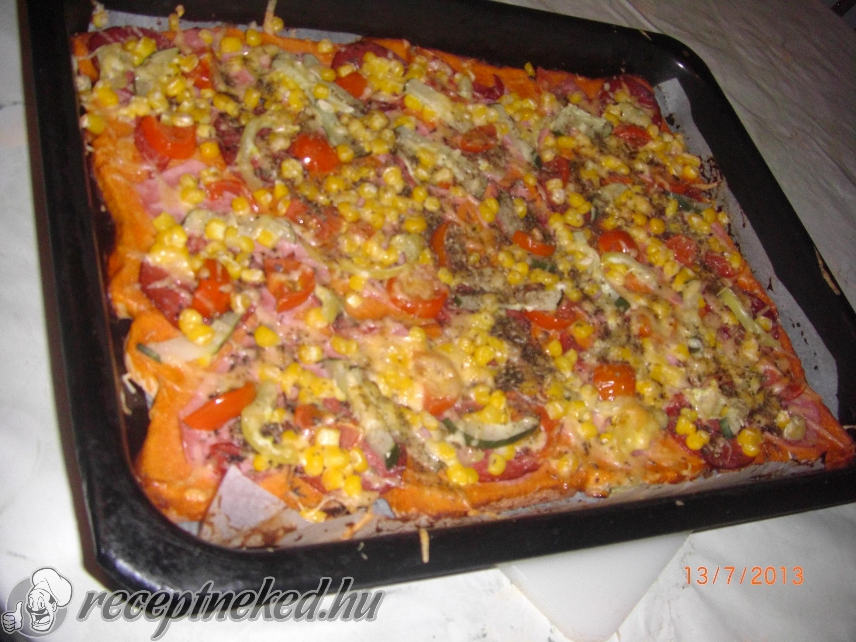 Amíg a tészta kel, addig elkészítjük a feltétet. A paradicsompürét, ketchupot keverjük el az oregánóval. A párizsit, szalámit és a karajt szeljük fel, a sajtot pedig reszeljük le.