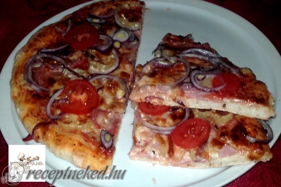 A megkelt tésztát nyomkodjuk sütőpapíros tepsibe (ez a tészta mennyiség két nagy tepsihez elegendő), majd kenjük meg a paradicsomos kencével, rászórjuk a szalámikat és megszórjuk a sajttal.