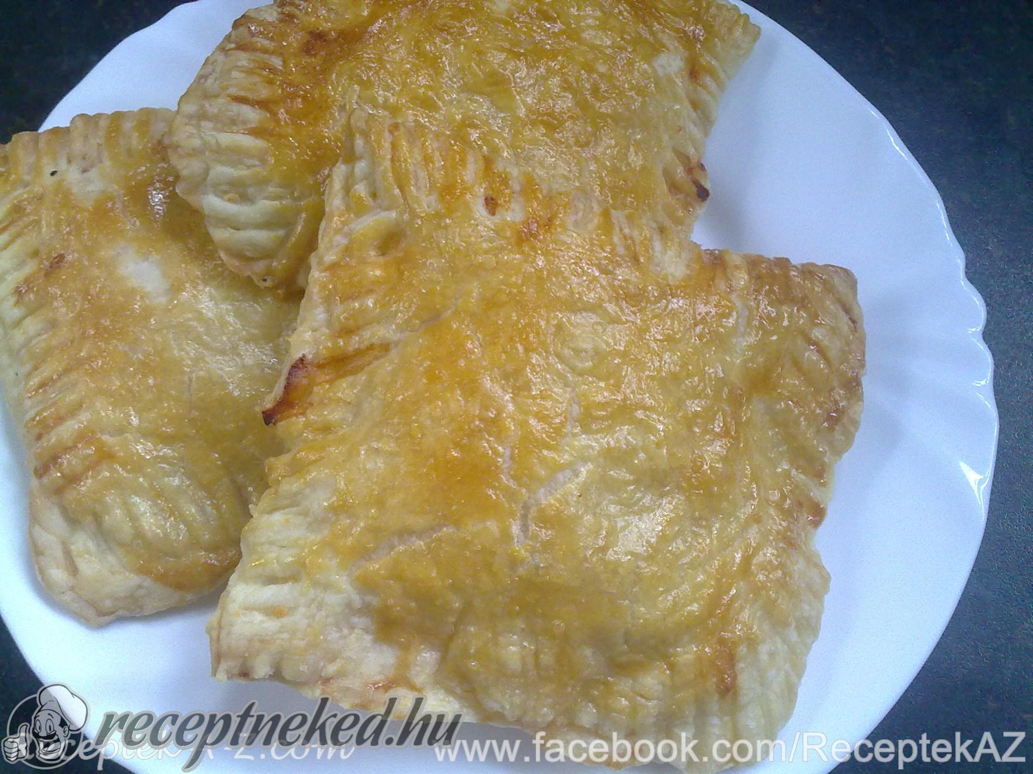 A tészta alsó részét megkenjük ketchuppal, megszórjuk apróra vágott sonkával, apróra vágott hagymával és reszelt sajttal majd a tészta felső részét ráhajtjuk. Villával szorosan lenyomkodjuk a széleket, majd sütőpapírral bélelt tepsire fektetjük őket.