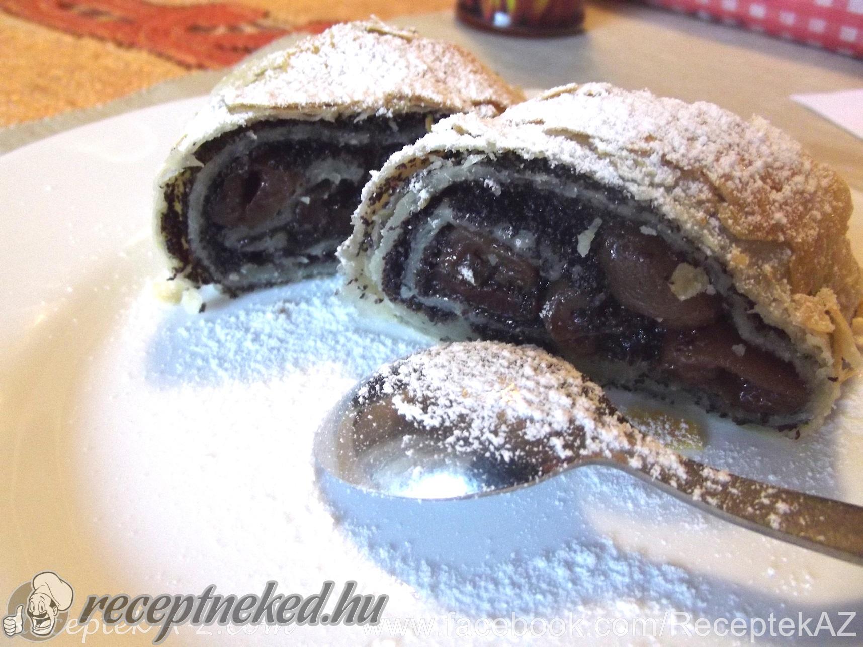 A tekercset 2 részre vágjuk, és egyenként vékony lappá nyújtjuk. Szélére tesszük a tölteléket, és feltekerjük.