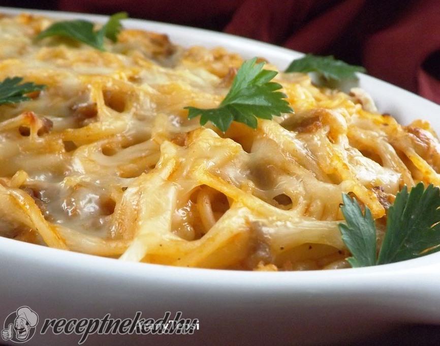 [box style=”info”]Egyszerű húsos spagettinek készült. Közben gondoltam egyet, kerámia tepsibe pakoltam, és sok sajttal megsütöttem. Nagyon finom lett. Egészen más ízű, mint a hagyományos módon készült változat. Ha kihűl, akkor szépen lehet kockára vágni. Azt már sajnos nem volt lehetőségem lefotózni ;-)[/box]