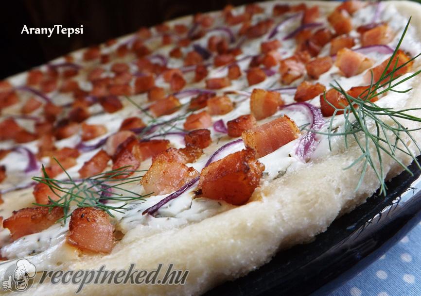 Az egyiket az előkészített formába rakjuk, kézzel a forma széle felé lapítjuk, toljuk és kis peremet is kialakítunk. Lekenjük két evőkanálnyi kapros tejföllel, megszórjuk a szalonna felével és a lila hagyma egy részével.