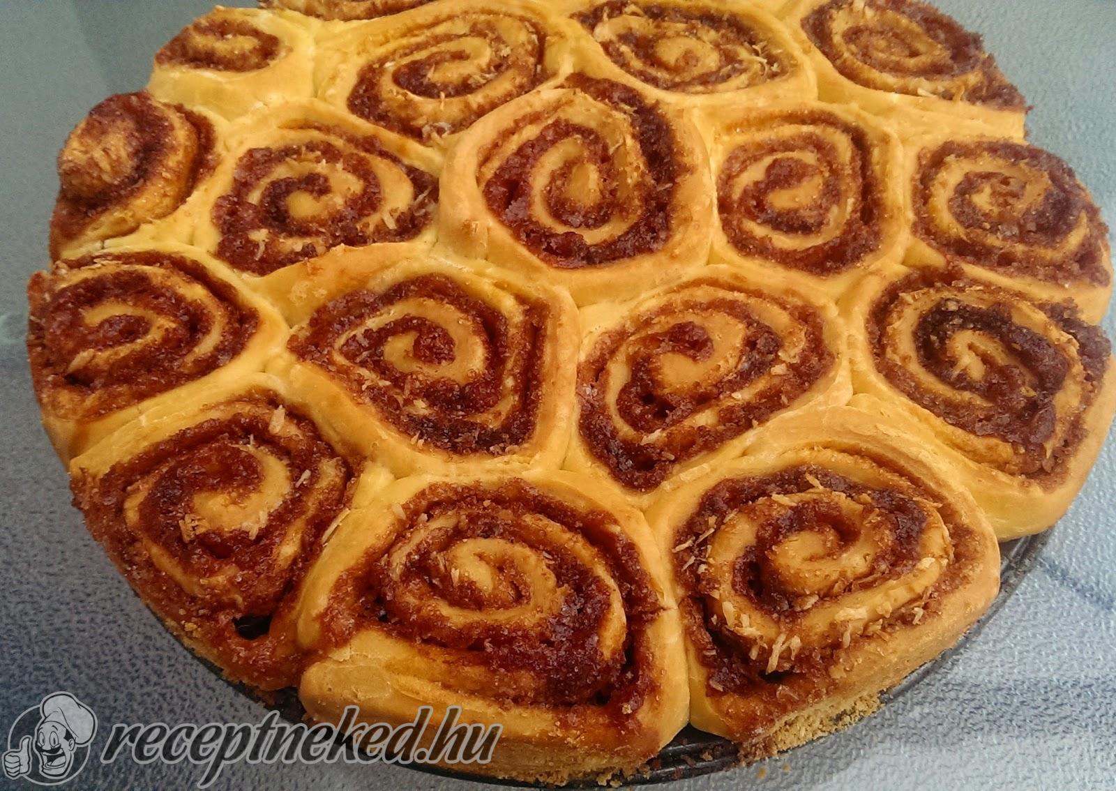 A tésztát picit belisztezett felületen kb fél cm vékony, téglalap alakúra kinyújtjuk és megkenjük olvasztott vajjal. Ezután a cukorral összekevert kakaóval megszórjuk, majd rászórjuk a kókuszreszeléket is. Feltekerjük mint a bejglit és kb 1,5 cm széles csigákat vágunk belőle.