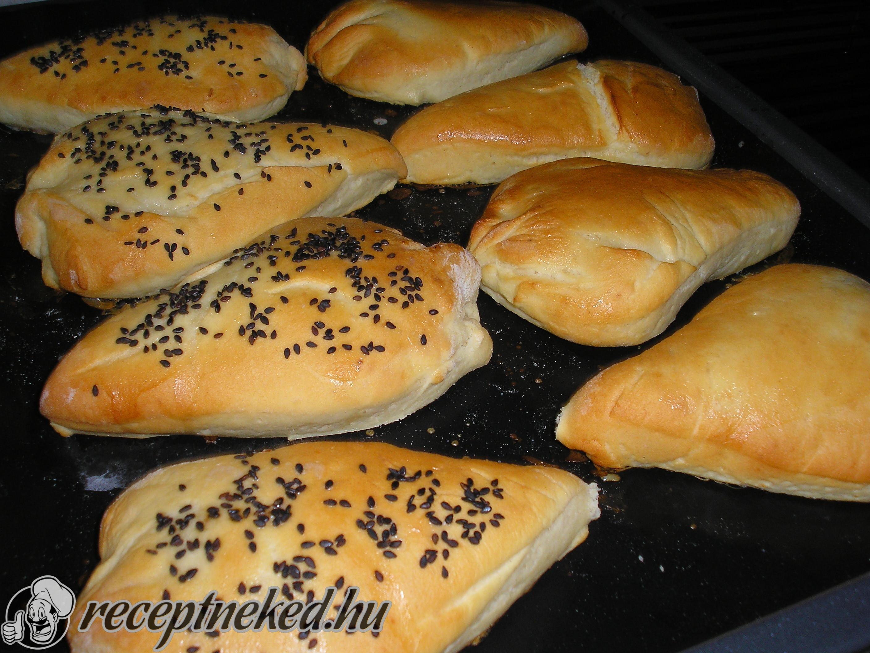 Lisztes asztalra borítjuk, átgyúrjuk. Két részre vágjuk, majd kinyújtjuk kb. 25 cm átmérőjű körökké. Görgős vágóval körönként 8 cikkre vágjuk.